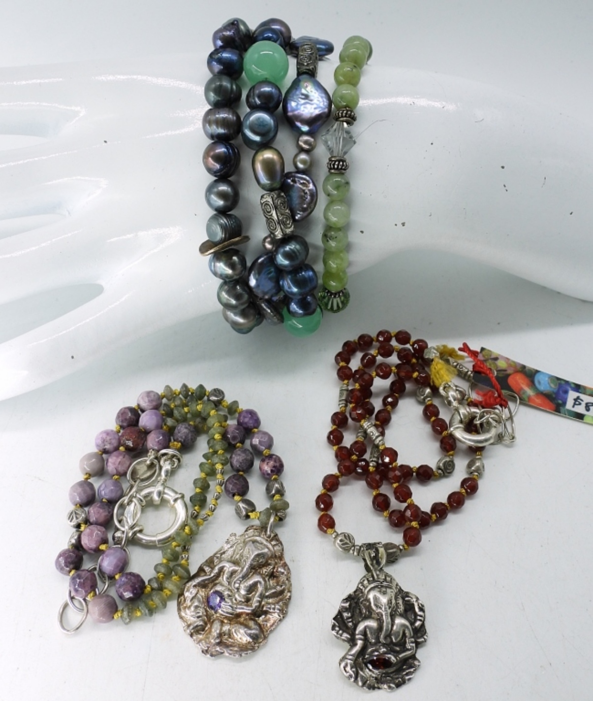 APACHE TEAR, PIERCED EARRINGS. TWO BEADED GEMSTONE NECKLACES,17-18″. TWO NATURAL GEMSTONE BRACELETS, 7-8″.