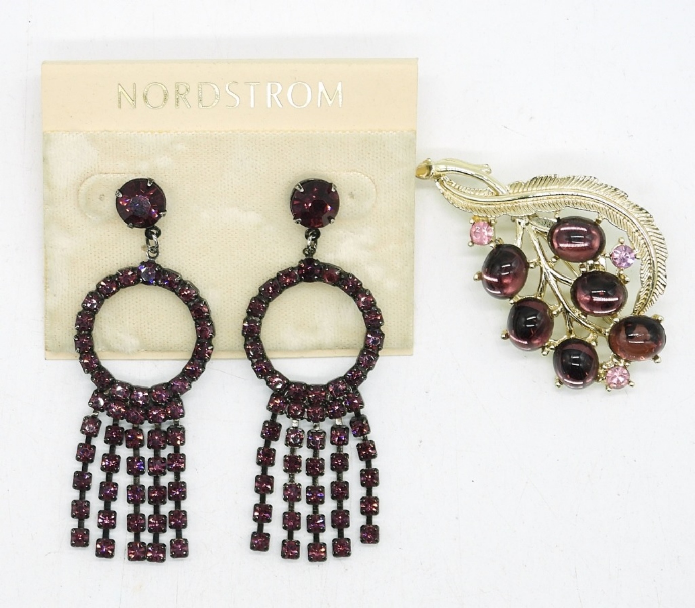 PIERCED EARRINGS, 2.5″ LONG. GOLD TONE PURPLE STONE BROOCH, 2″.