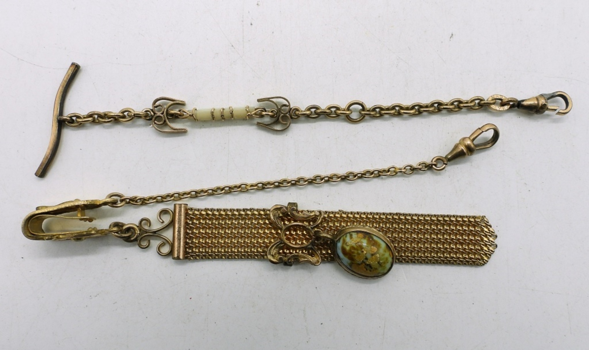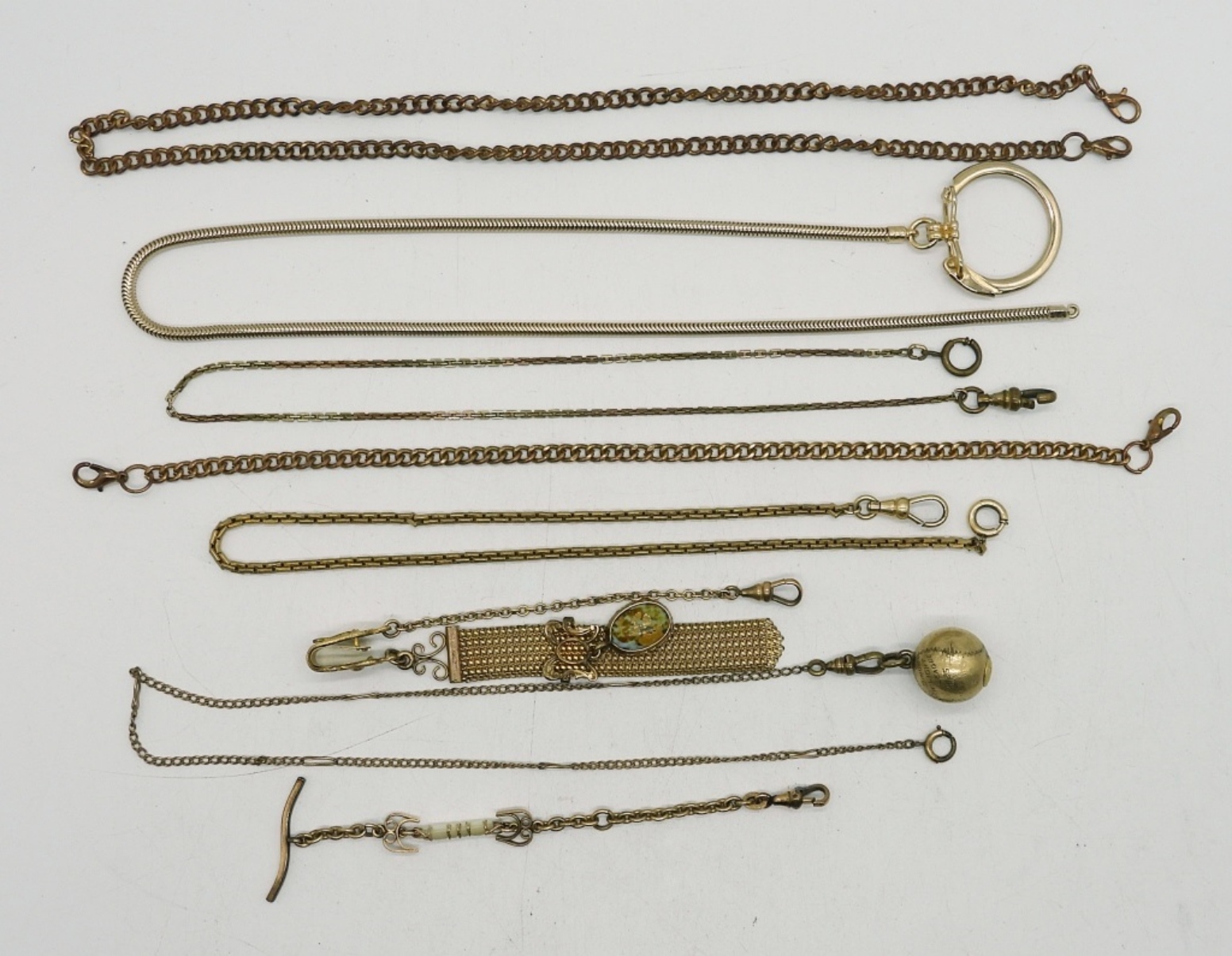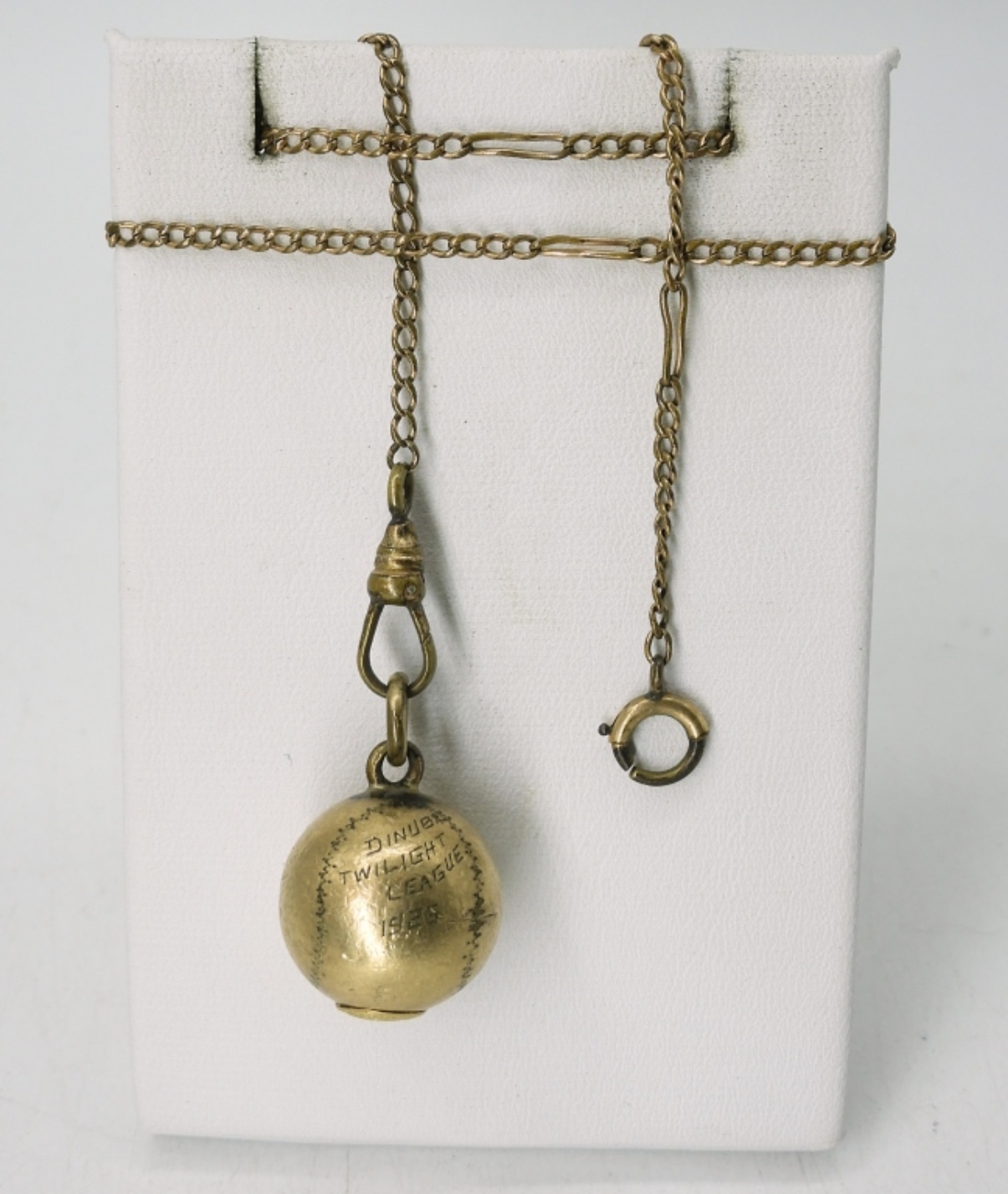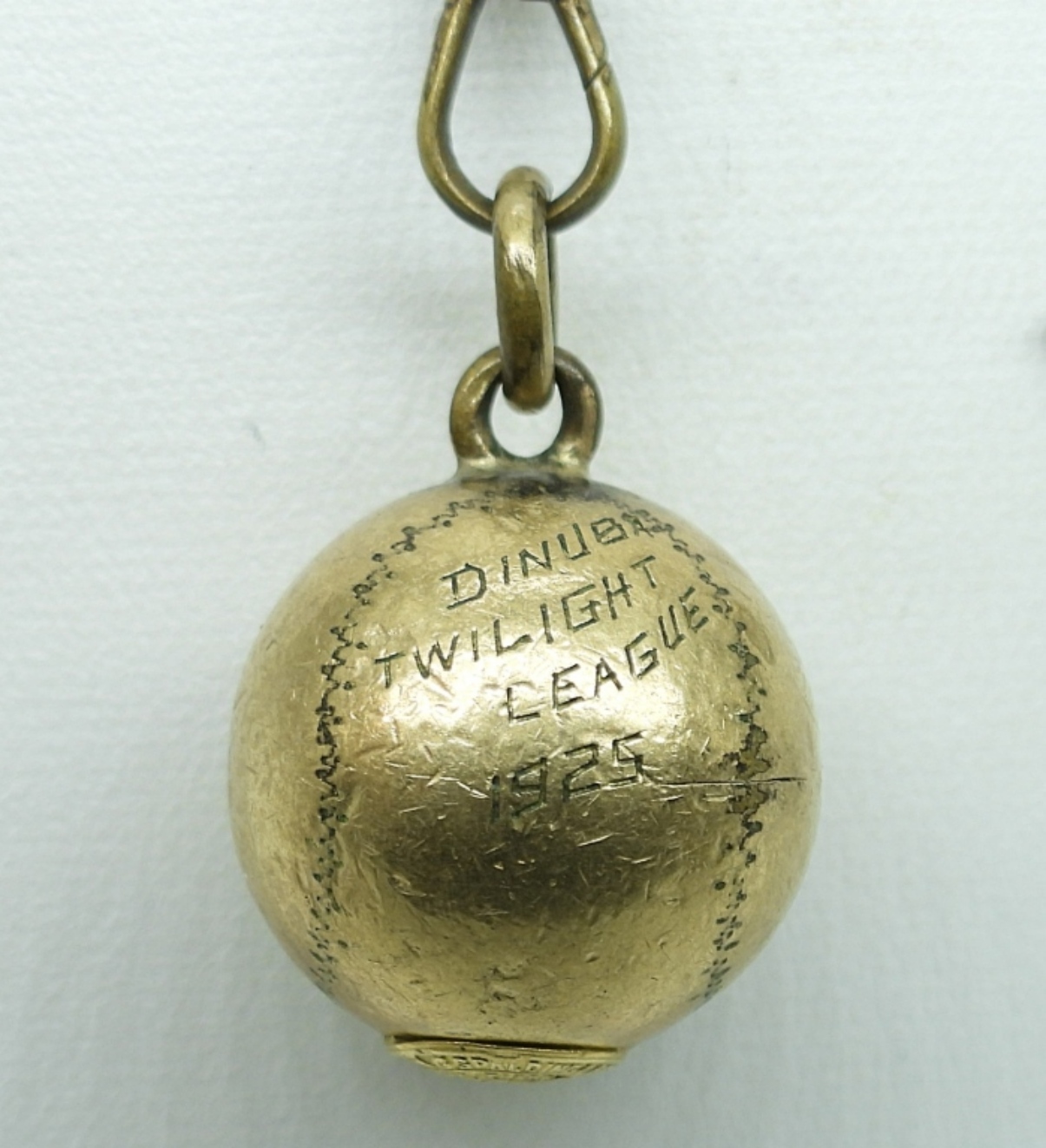 BASEBALL WATCH CHAIN, BALL HAS A SPALDING LOGO ON BOTTOM, ENGRAVED WITH “DINUBA TWILIGHT LEAGUE 1925″, 15″. SEVEN OTHERS, 4.5″-18”.