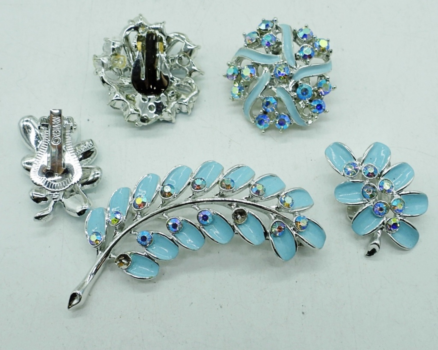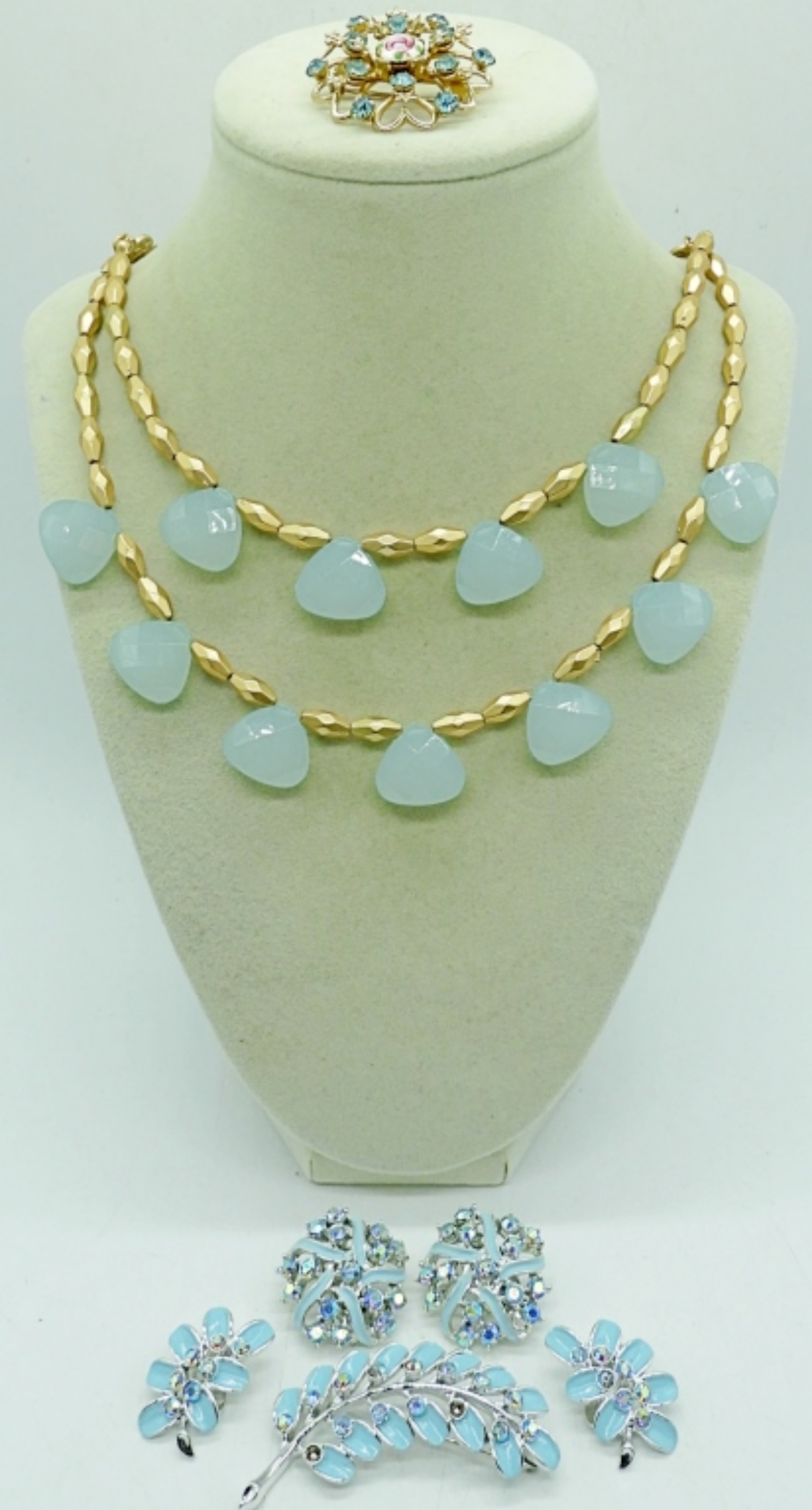 GORGEOUS VINTAGE KRAMER BROOCH WITH MATCHING CLIP ON EARRINGS, IN WONDERFUL CONDITION! GOLD TONE BLUE GEMSTONE NECKLACE, 20″. BLUE ENAMEL CLIP ON EARRINGS & VINTAGE BROOCH.