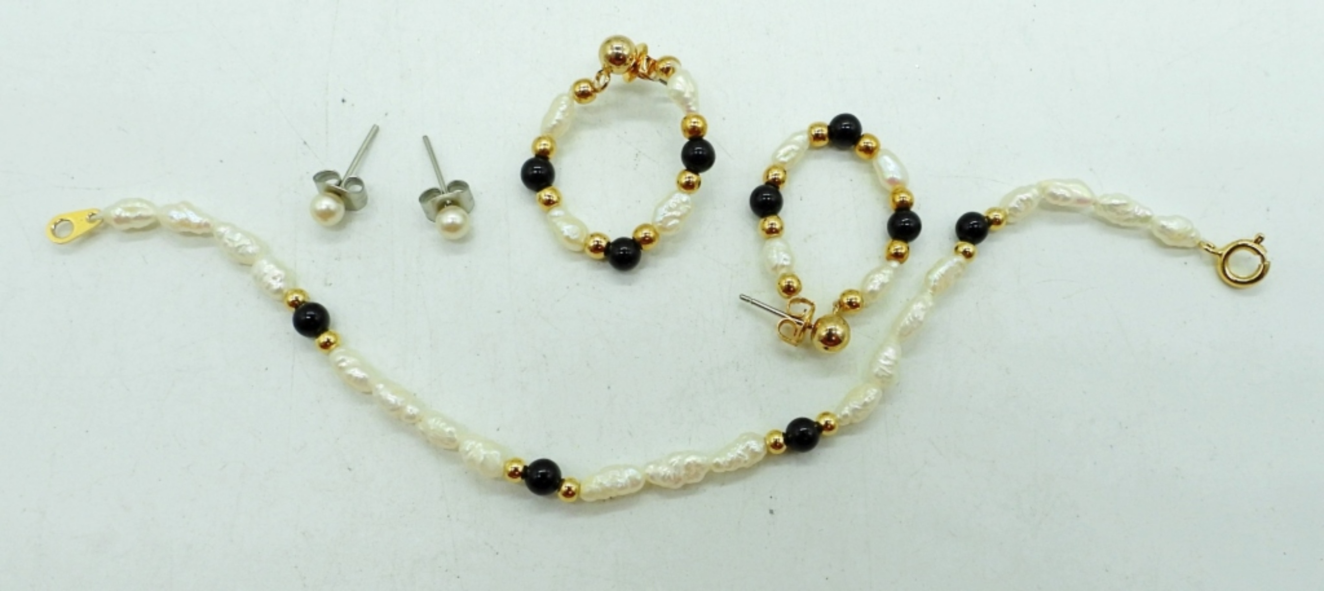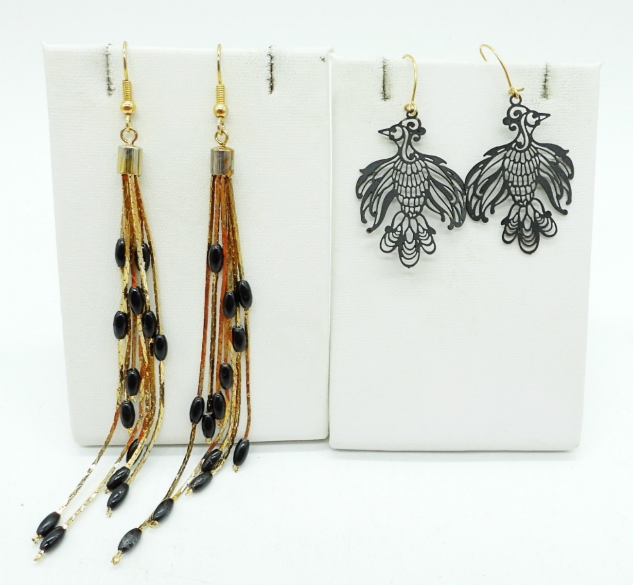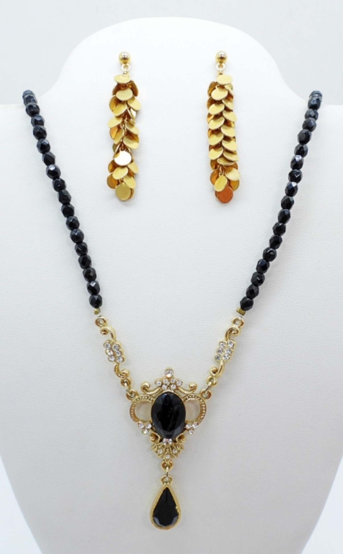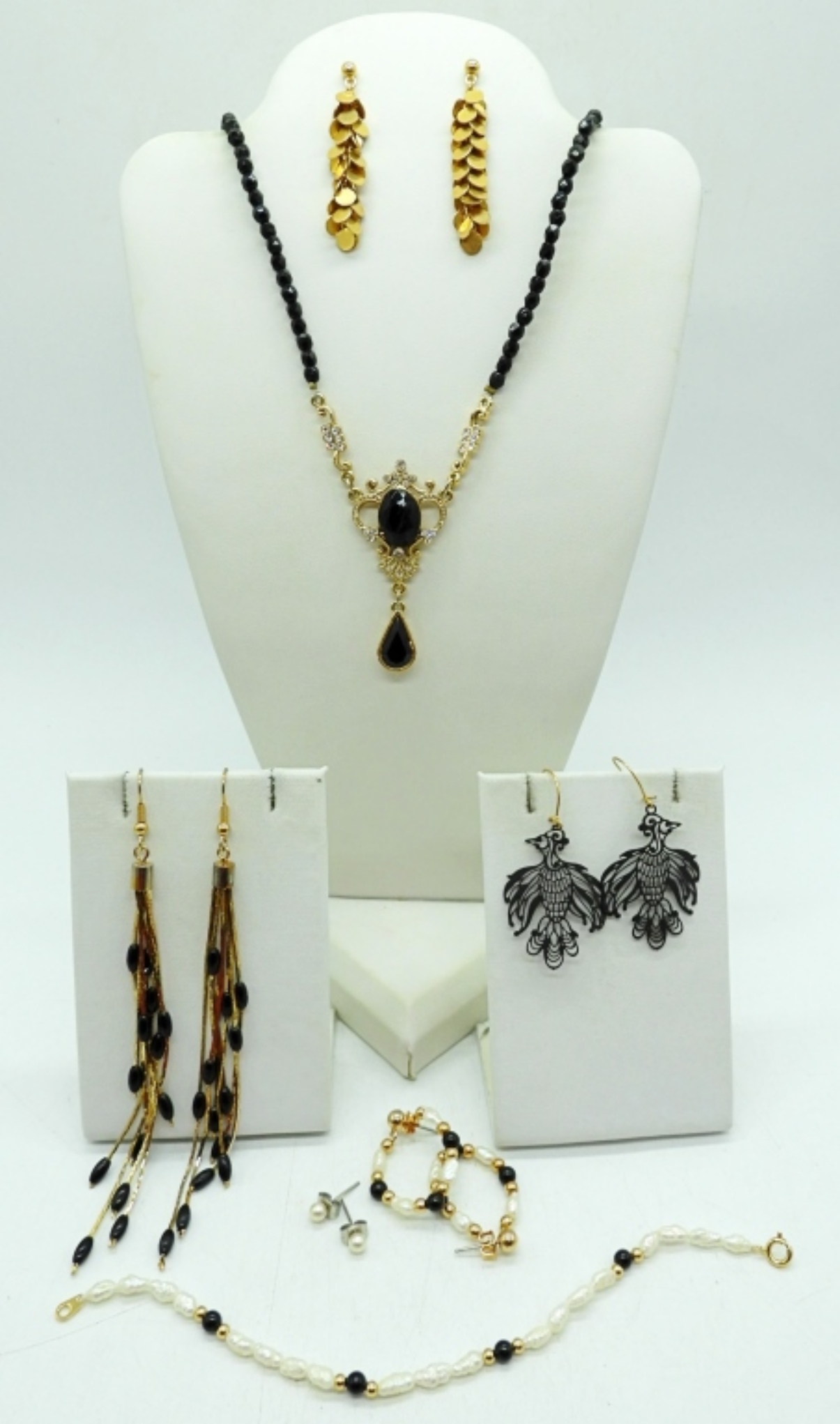 GOLD TONES, BLACK BEADS. NECKLACE, 18″. FIVE PAIR PIERCED EARRINGS. BRACELET 7″.