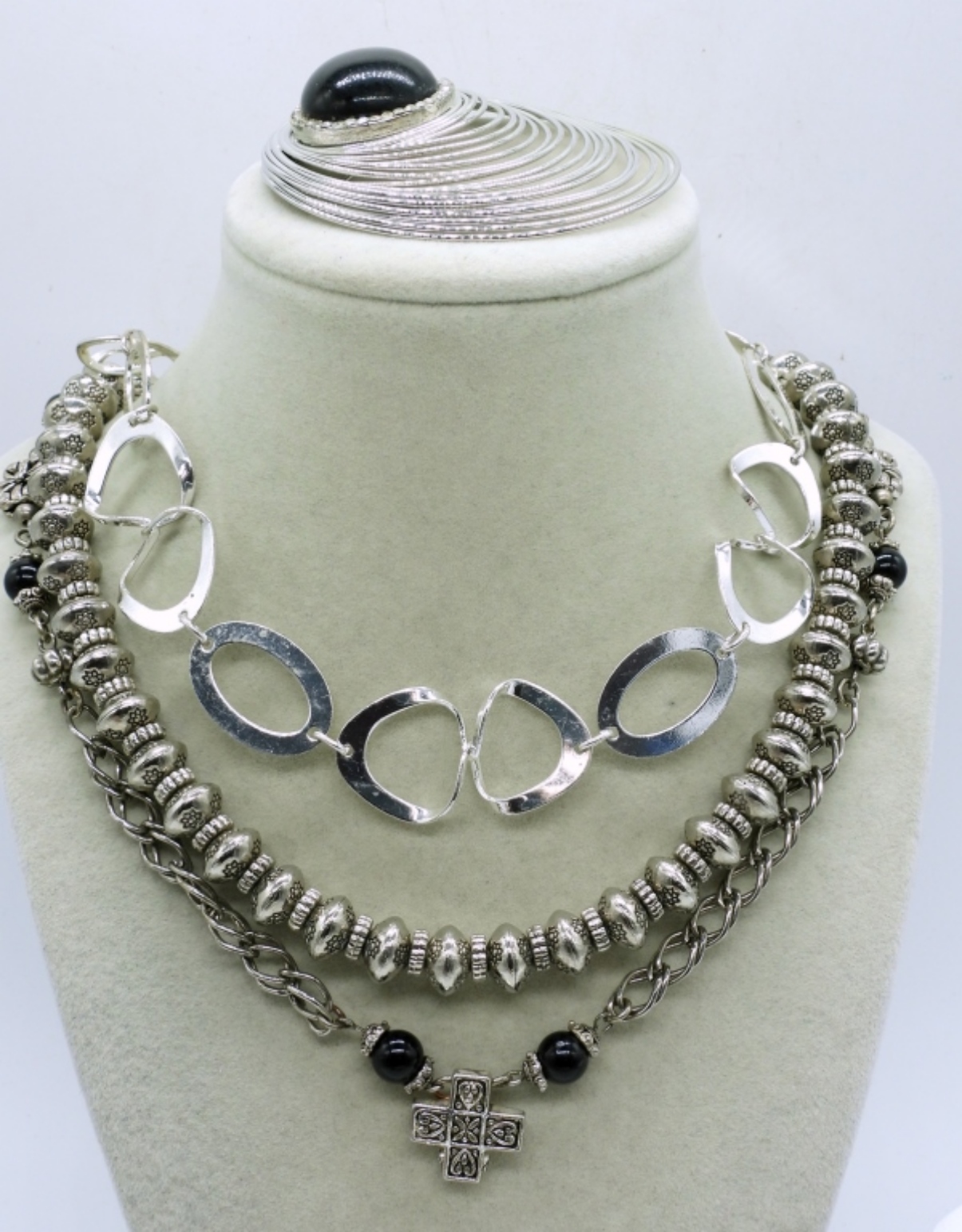 LADIES SILVER TONE FASHION JEWELRY, 22′ SILVER TONE NECKLACE,26″ SILVER TONE NECKLACE, 30′” SILVER TONE NECKLACE WITH BLACK BEADS,2 SILVER TONE BRACELETS, A SILVER TONE AND BLACK BROOCH AND A SIZE 7 RING