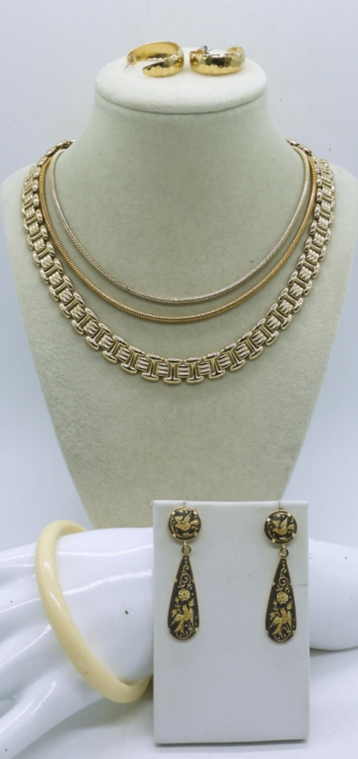 6 PIECE GOLD TONE LADIES JEWELRY SET,(3) 18′ GOLD TONE NECKLACES ,2 PAIR OF GOLD TONE EARRINGS AND A BANGEL BRACELET