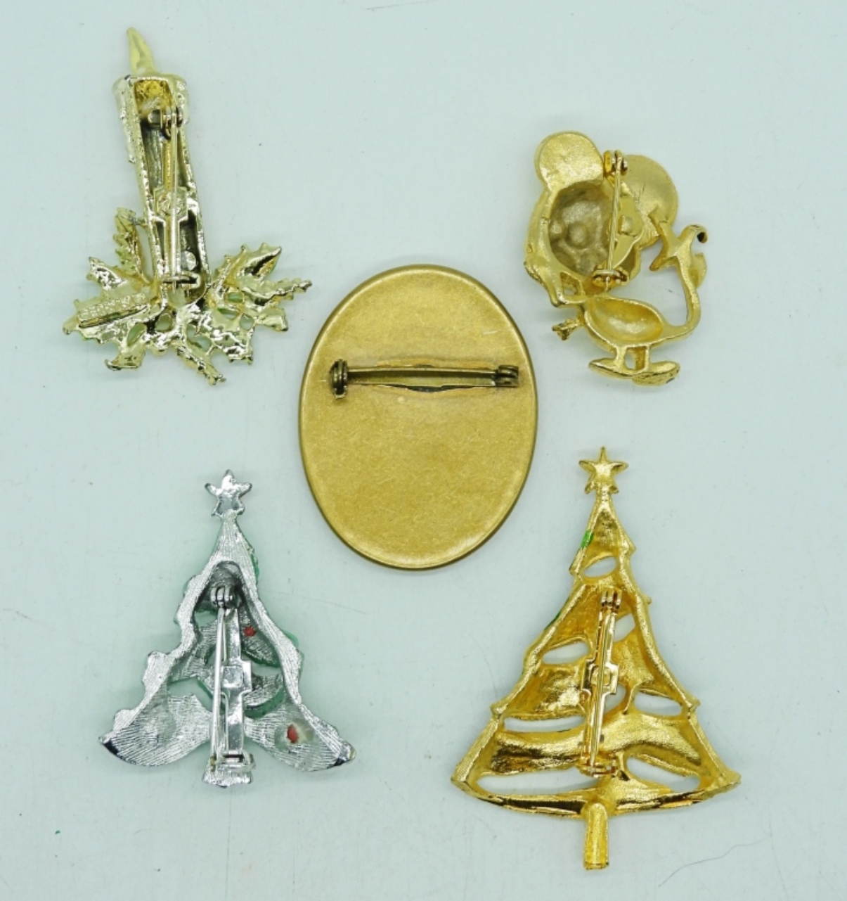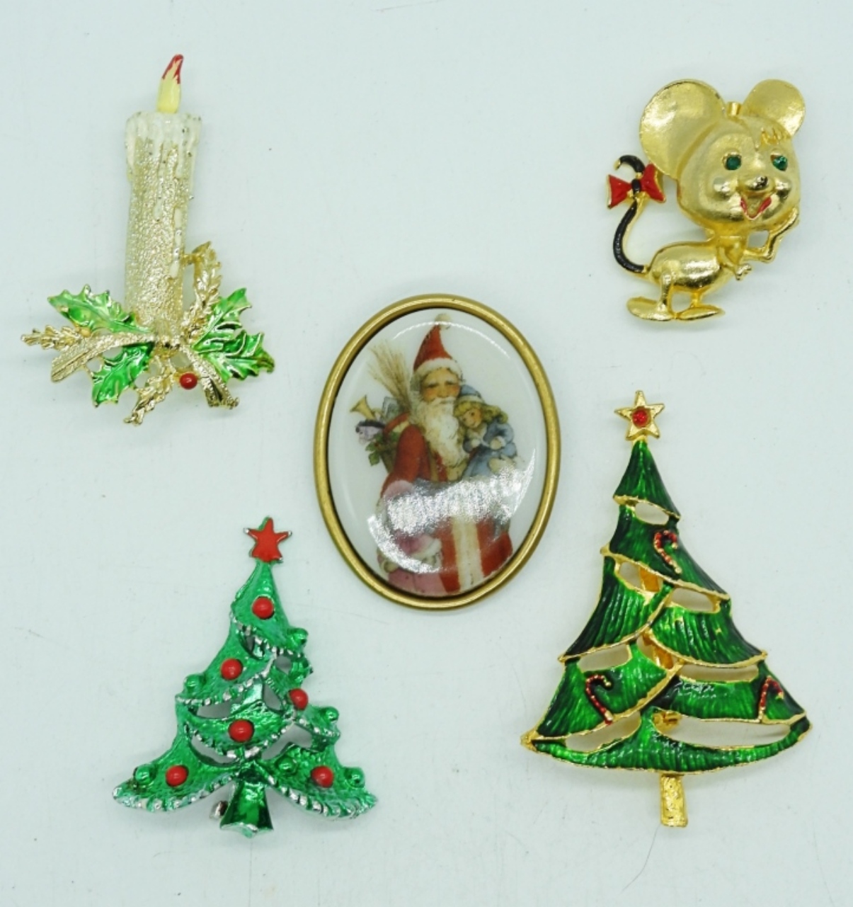 FIVE VINTAGE HOLIDAY PINS / BROOCHES. 1.5″-3″.