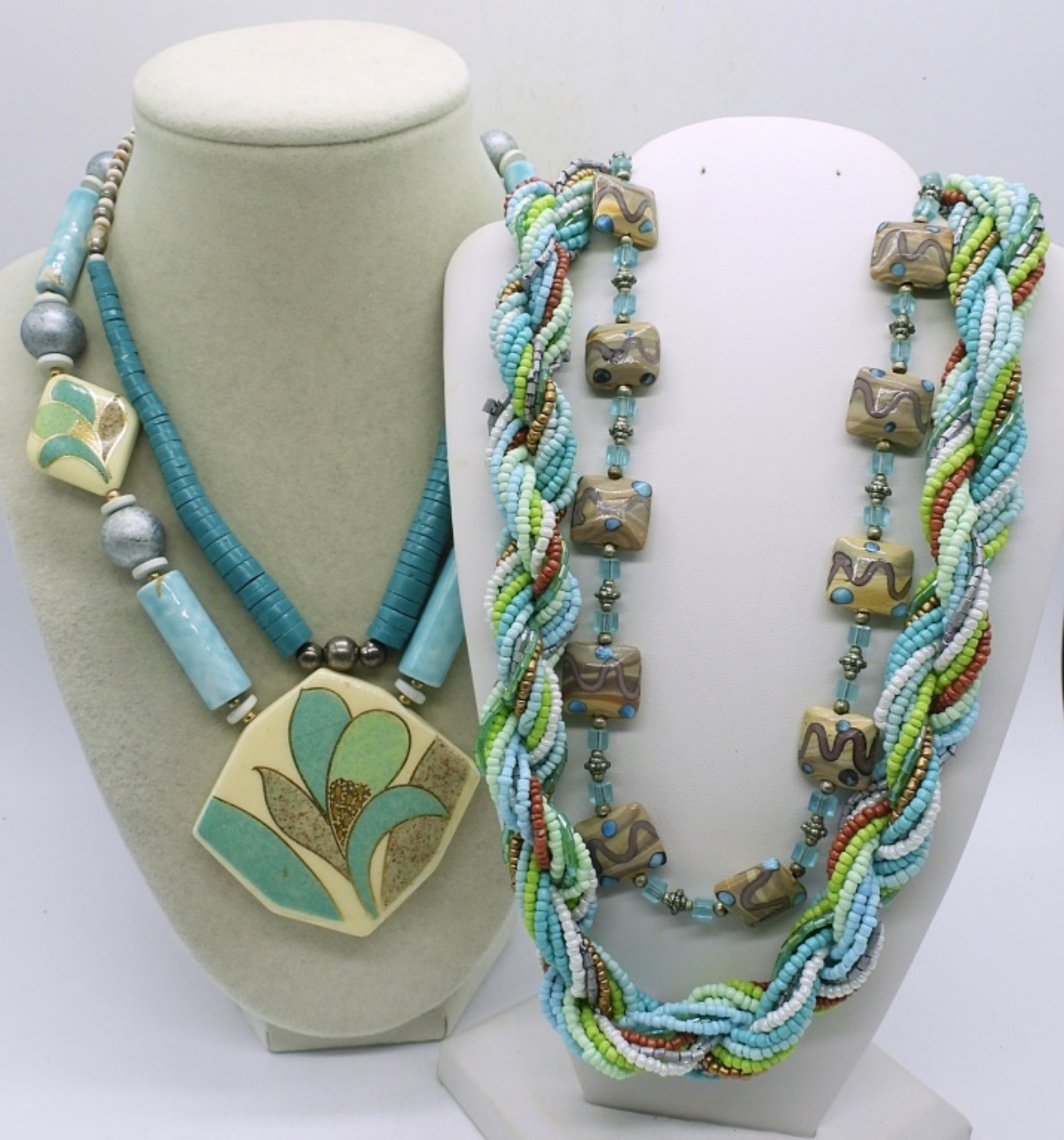 FOUR VINTAGE BEADED TEAL COLORED NECKLACES. 18-20″.