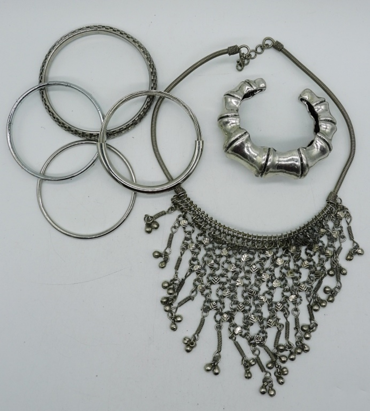 22″ VINTAGE SILVER TONE BIB COLLAR NECKLACE AND 4 SILVER TONE BRACELETS AND 1 CHUNKY SILVER TONE CUFF BRACELETS