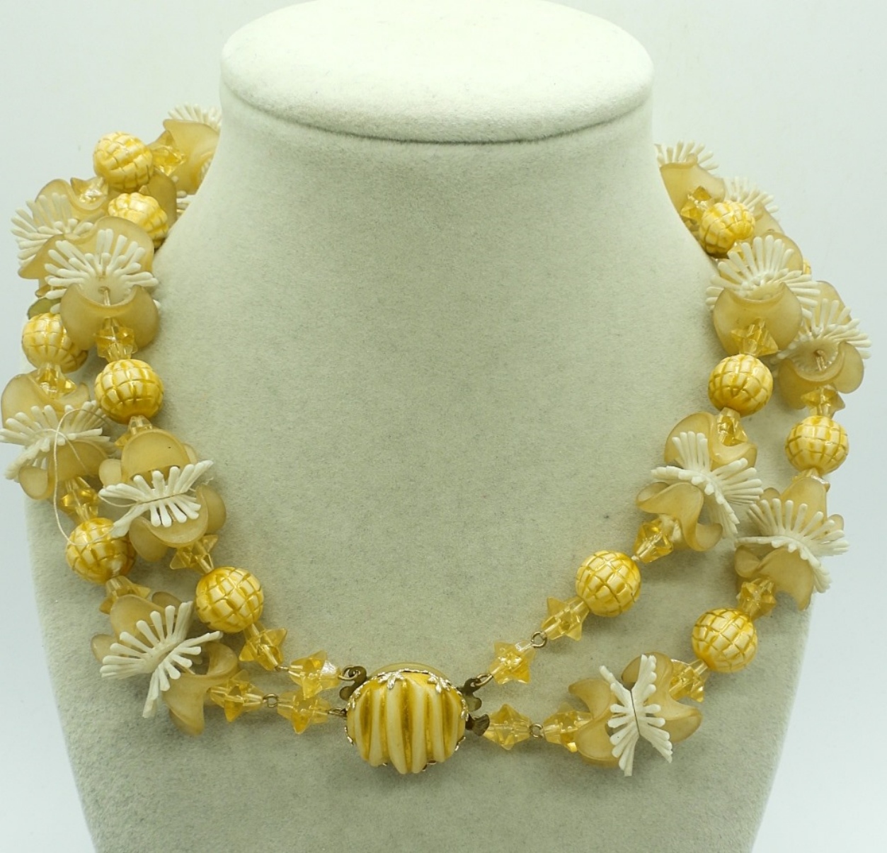 WINEY CREATIONS (ORIGINAL TAG ATTACHED) MADE IN GERMANY. POSSIBLY LUCITE, NECKLACE 19″. BOW BROOCH, 2″. PIERCED EARRINGS AND A RING SIZE 5.