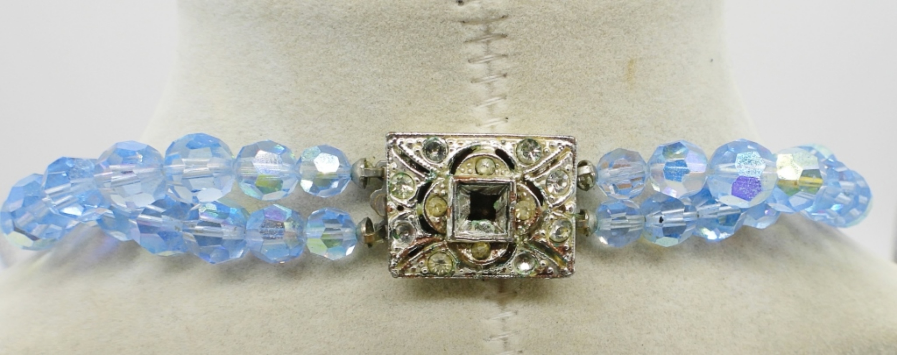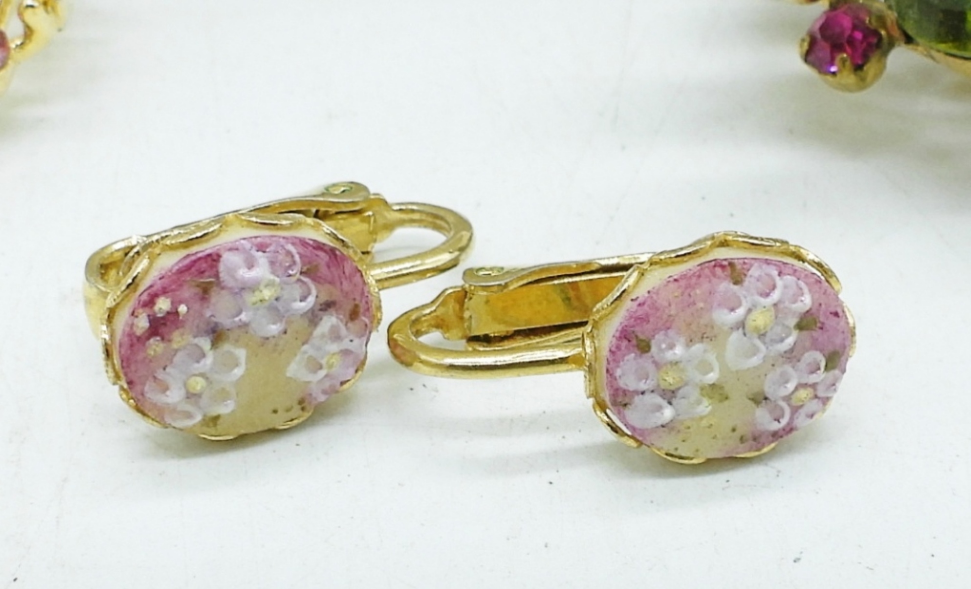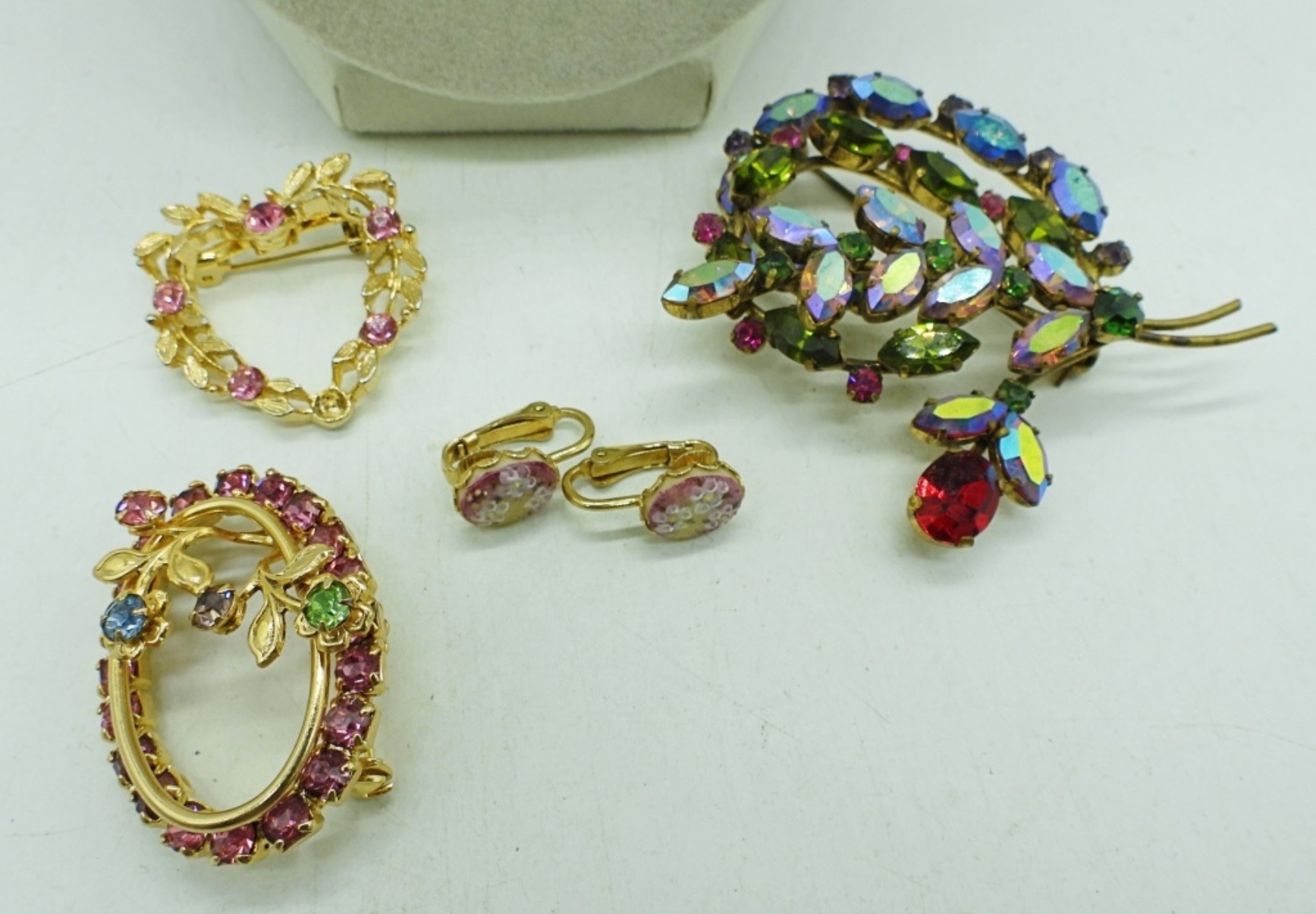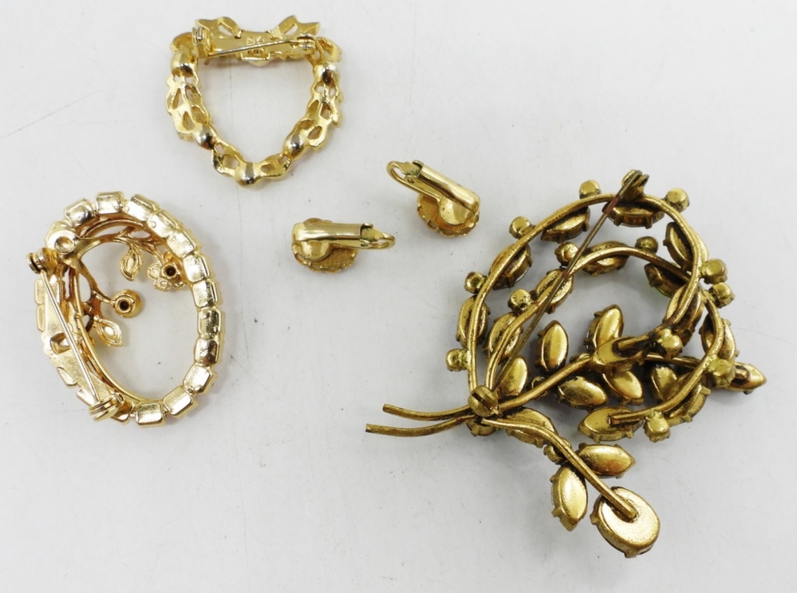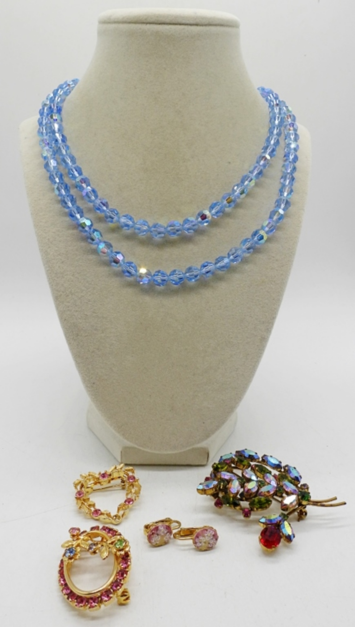 3 VINTAGE RHINESTONE BROOCHES. ONE WITH 1 URANIUM GLASS. CLIP ON EARRINGS AND ONE NECKLACE 32″.