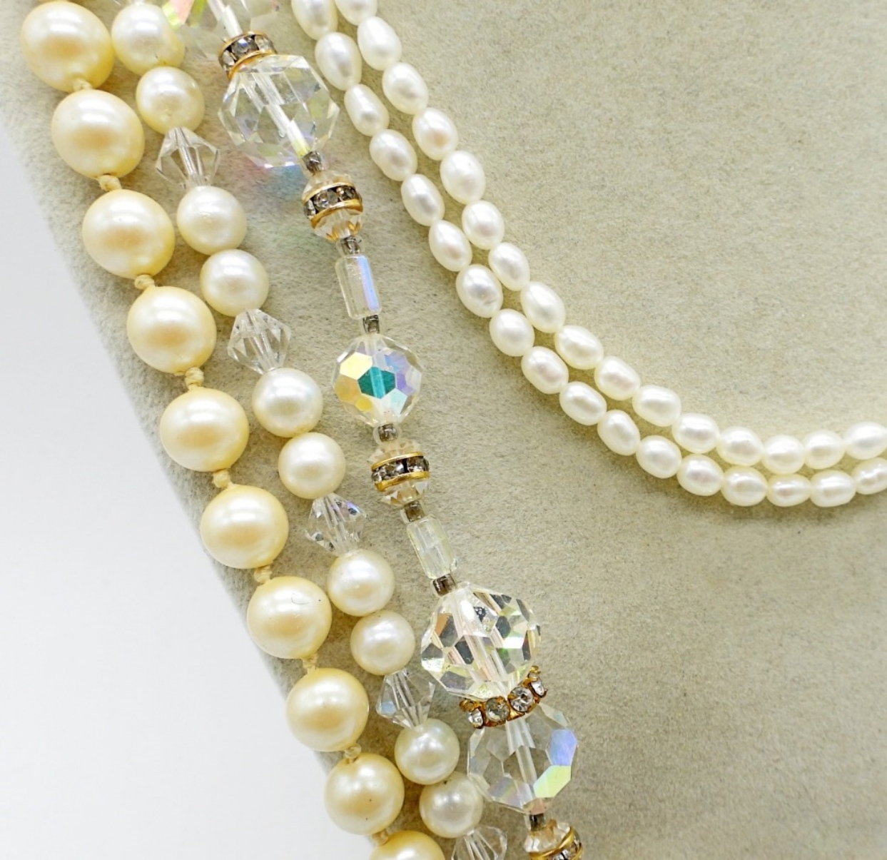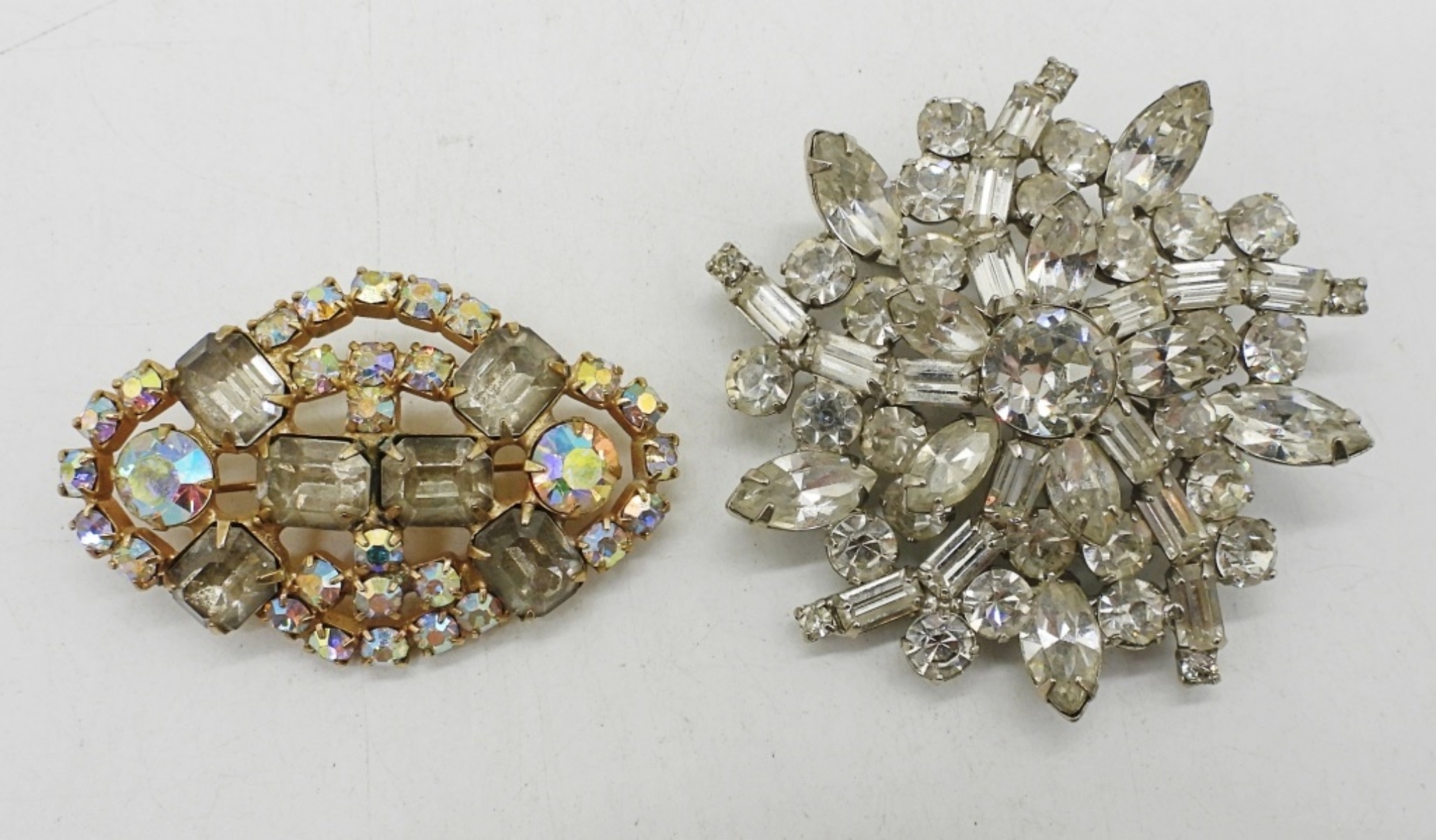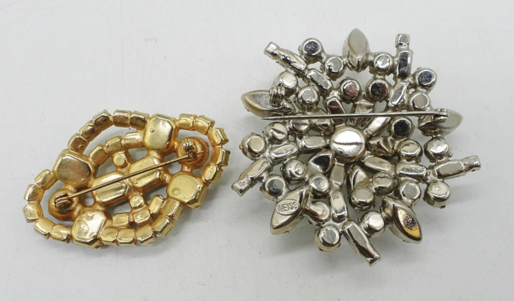 WEISS SILVER TONE RHINESTONE BROOCH, 2.5″. GOLD TONE RHINESTONE BROOCH, 2″. NECKLACES ARE 17″, 21″ & 24″.