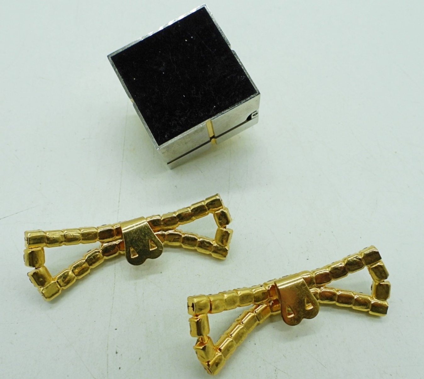 VINTAGE GOLD TONE BOW TIE SHOE CLIPS, 2″. SILVER & GOLD TONE TRINKET BOX, 1″.