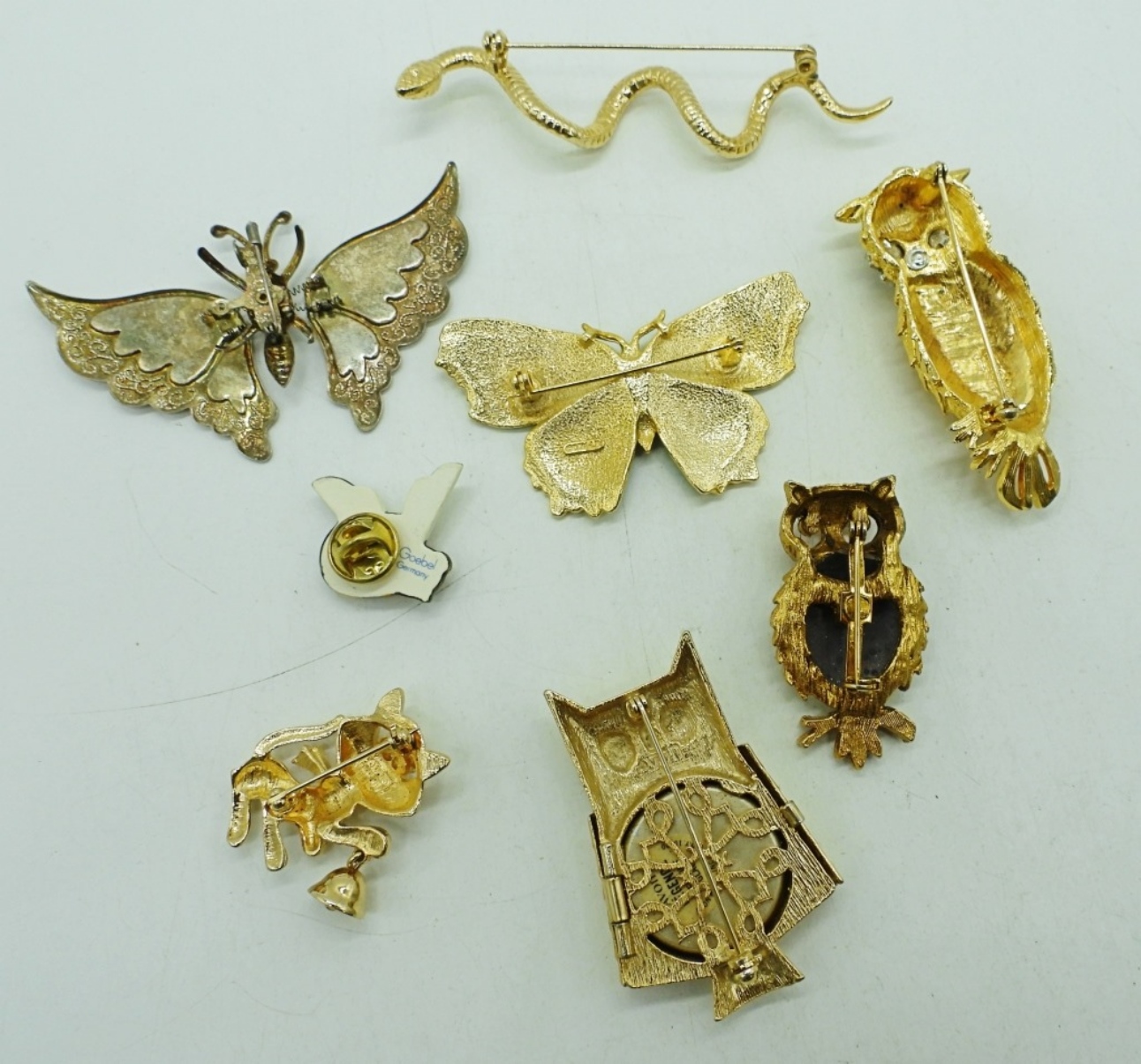 EIGHT GOLD TONE ANIMAL BROOCHES. AVON SOLID PERFUME OWL BROOCH.