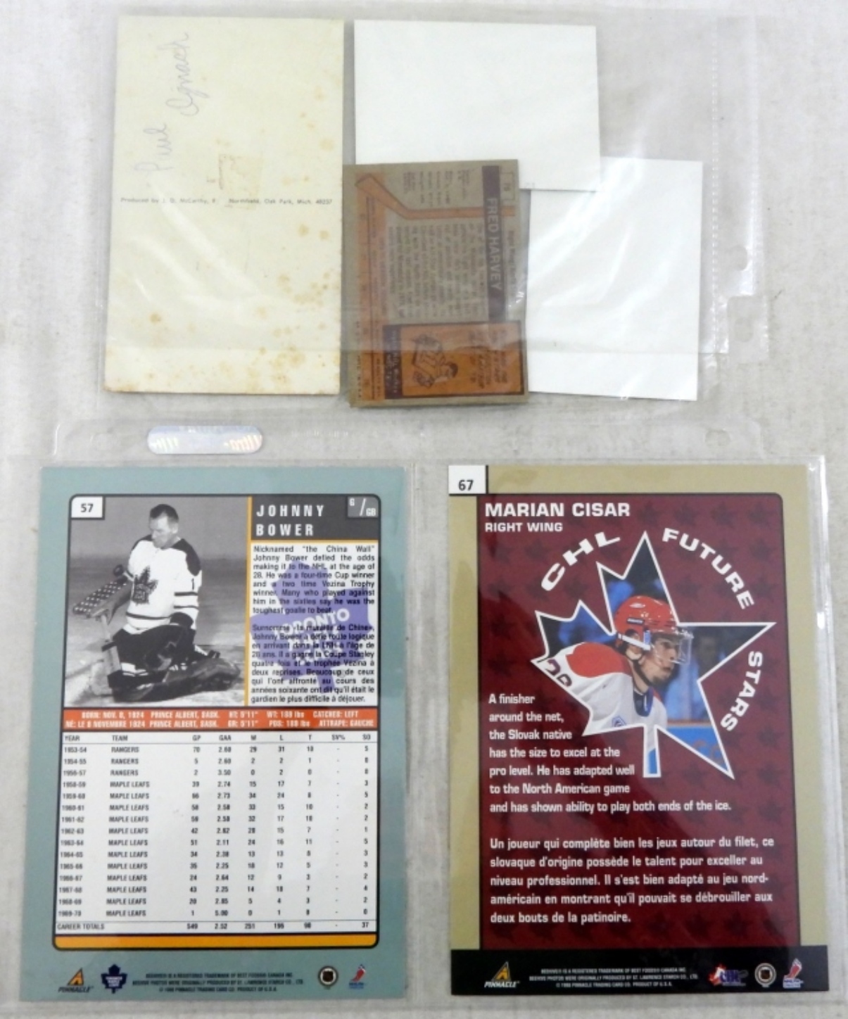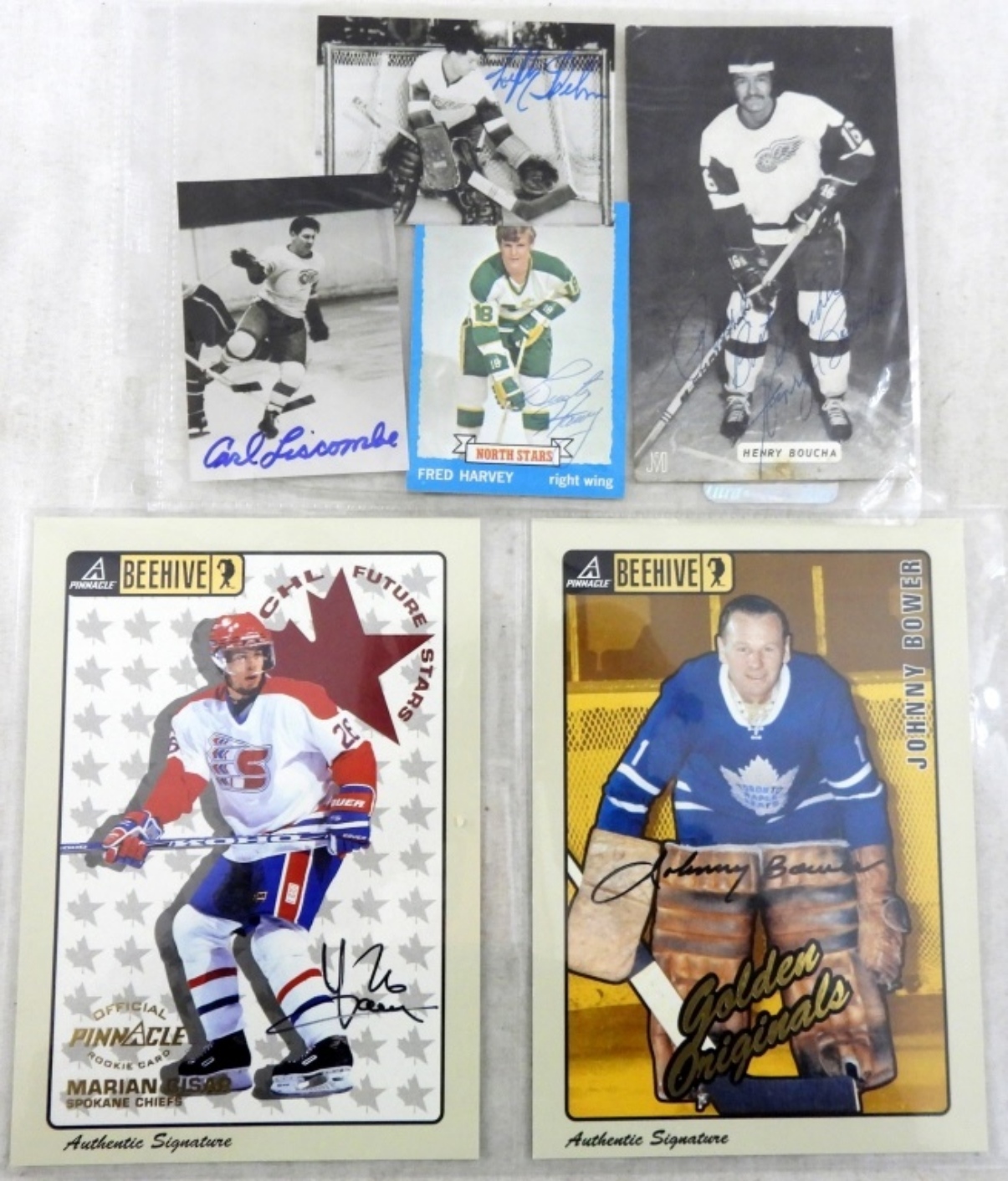 JOHNNY BOWER & MARIAN CISAR AUTHENTIC SIGNATURE SERIES 5×7 PINNACLE CARDS & (4) OTHER HOCKEY PLAYERS with NO COA / UNVERFIED