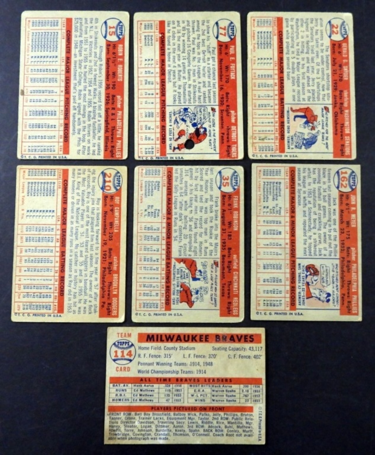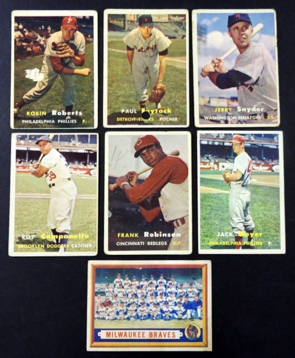 (7) 1957 TOPPS BASEBALL CARDS, # 35 FRANK ROBINSON,#210 ROY CAMPANELLA & MORE (GOOD ) 1 WITH A PUNCH HOLE