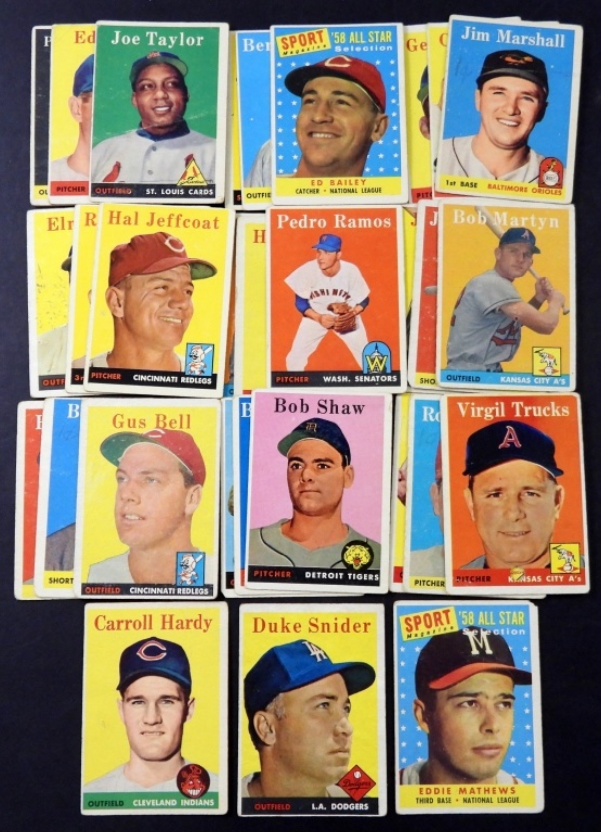 (39) 1958 TOPPS BASEBALL CARDS #88 DUKE SNIDER, ROOKIE #446 CARRLL HARDY , ALL STAR #480 EDDIE MATHEWS & MORE(VG/GOOD) 1OR 2 WITH PUNCH HOLES