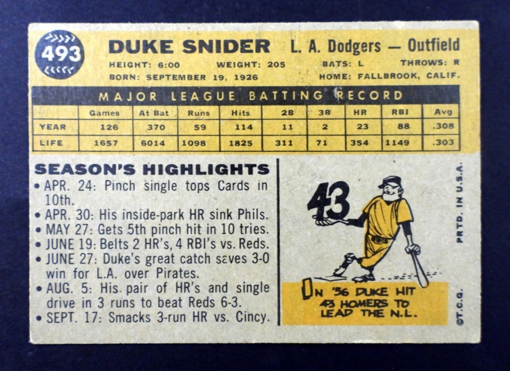 1960 TOPPS # 493 DUKE SNIDER (VG0