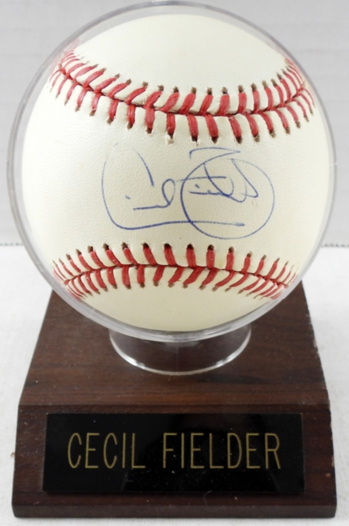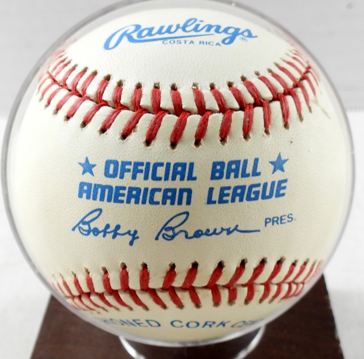 AMERICAN LEAGUE BALL – with WOOD BASE BALL HOLDER – NO COA