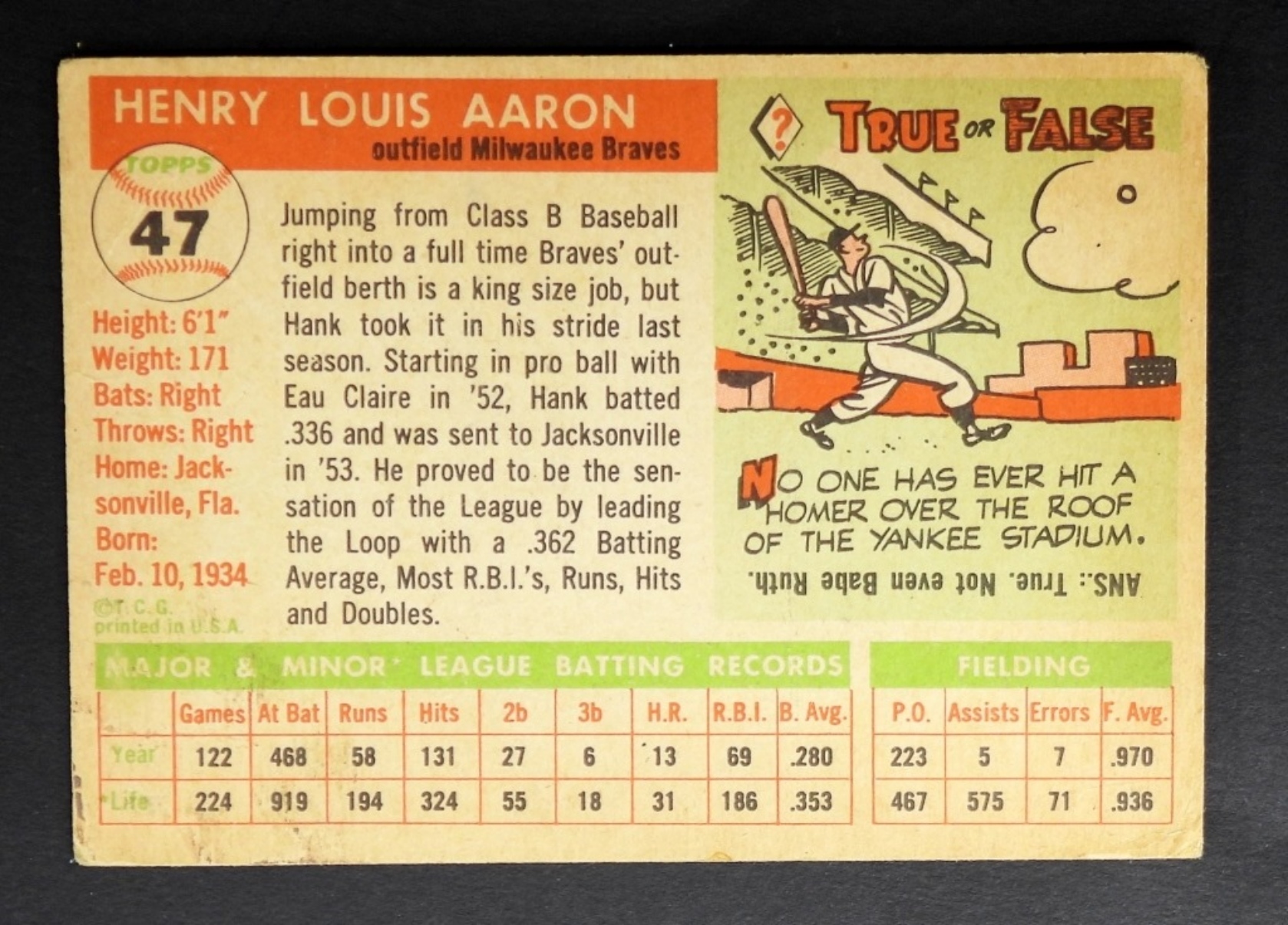 1955 TOPPS 447 HANK AARON VGEX (NICE COLOR)