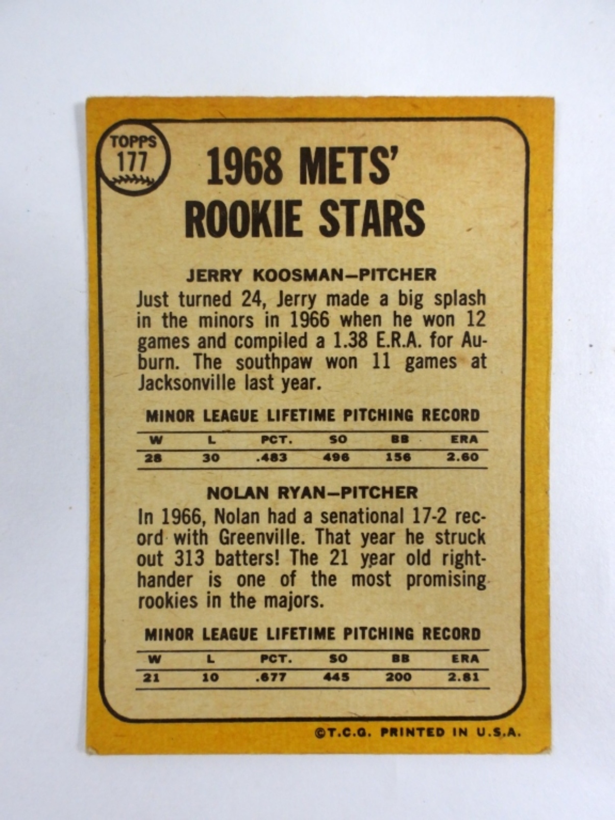 1968 TOPPS #177 JERRY KOOSMAN/NOLAN RYAN ROOKIE STARS (VGEX)