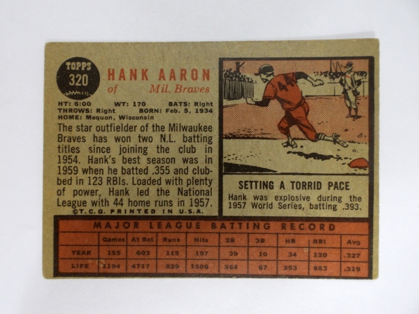 1962 TOPPS #320 HANK AARON (VG+)O/C