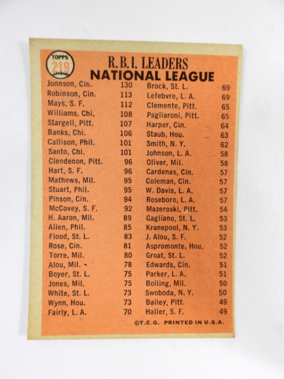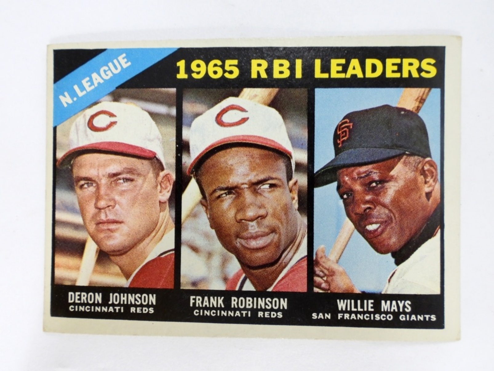 1966 TOPPS #219 RBI LEADERS DERON JOHNSON,FRANK ROBINSON,WILLIE MAYS (VGEX)