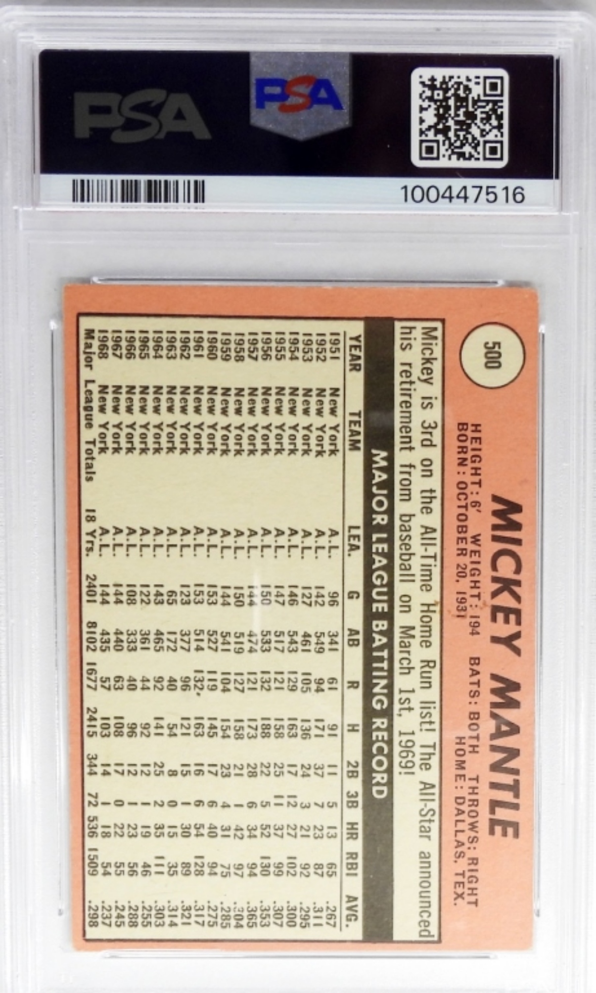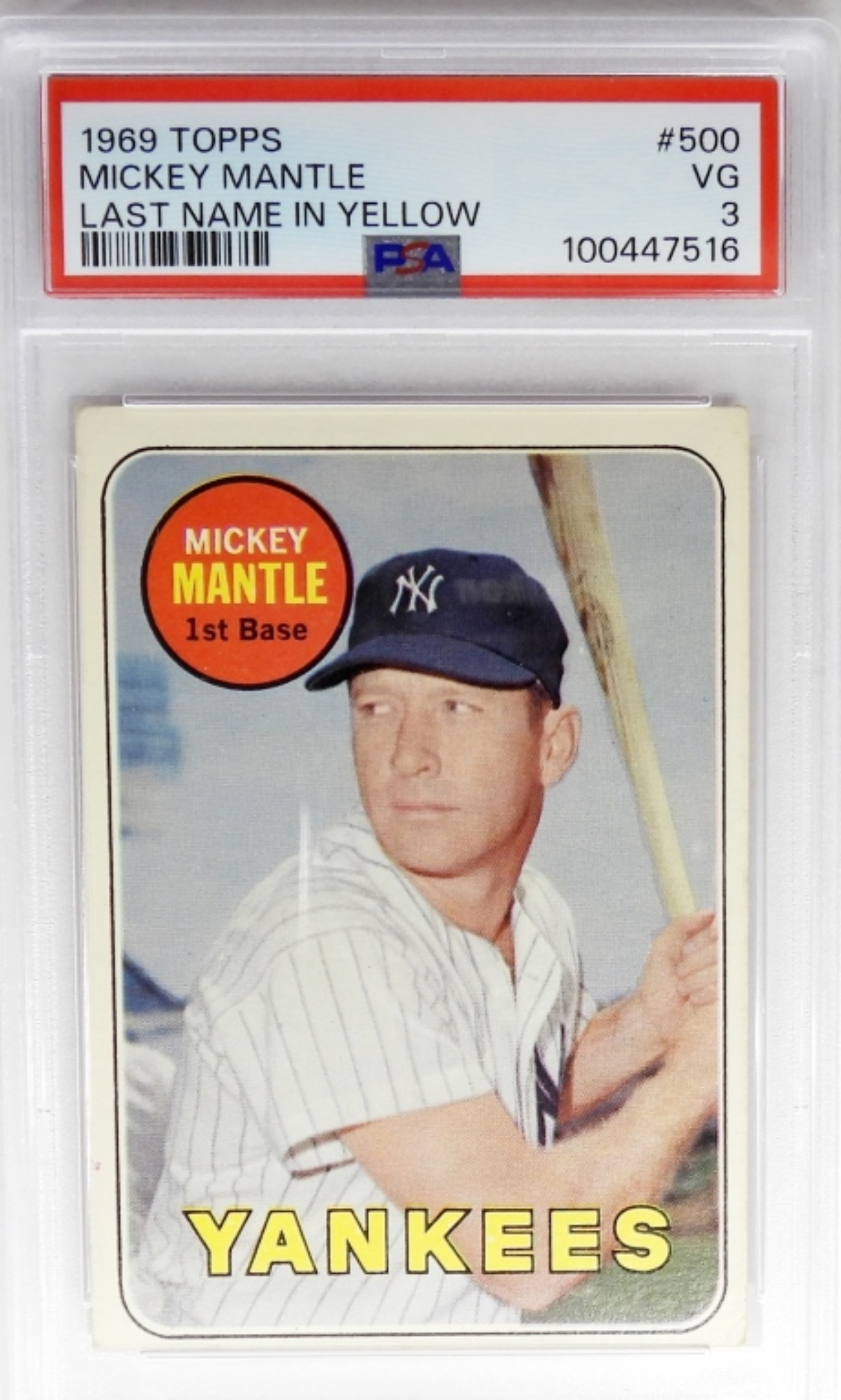 1969 TOPPS #500 MICKEY MANTLE PSA 3 VG (LAST NAME IN YELLOW)
