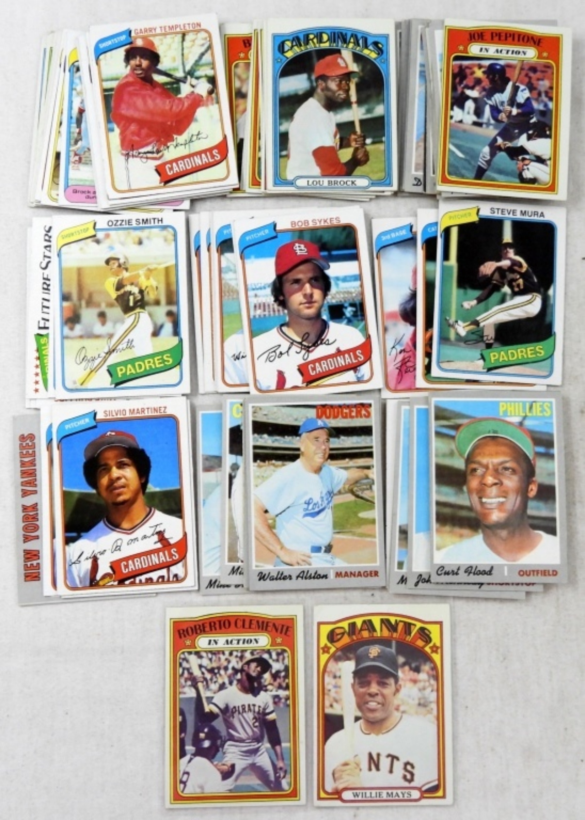 (75) 1970/1980 TOPPS BASEBALL CARDS ASSORTED TEAMS AND PLAYERS.LOADED WITH STARS! #310 ROBERTO CLEMENTE,#49 WILLIE MAYS & MORE OVERALL NICE CARDS