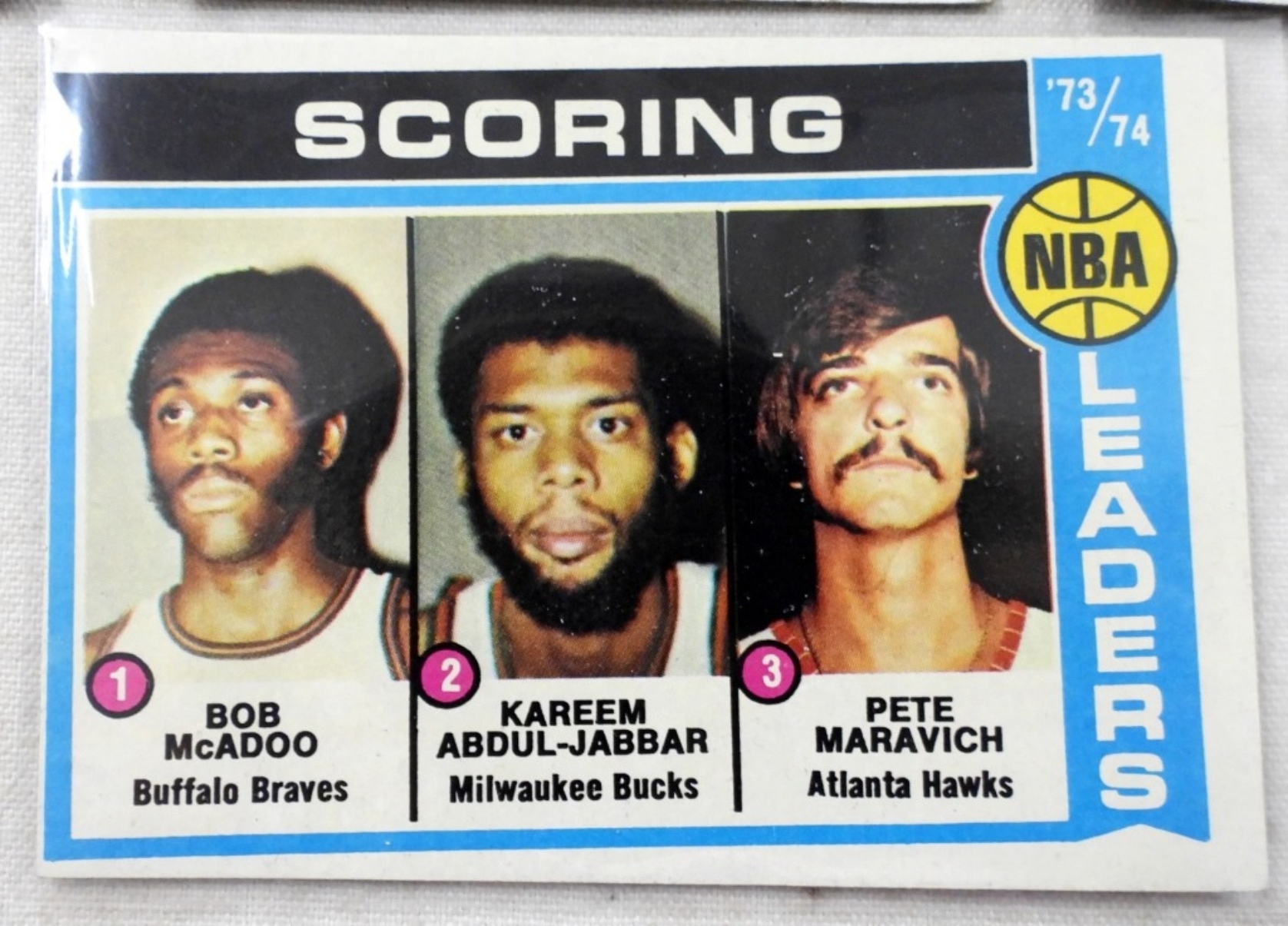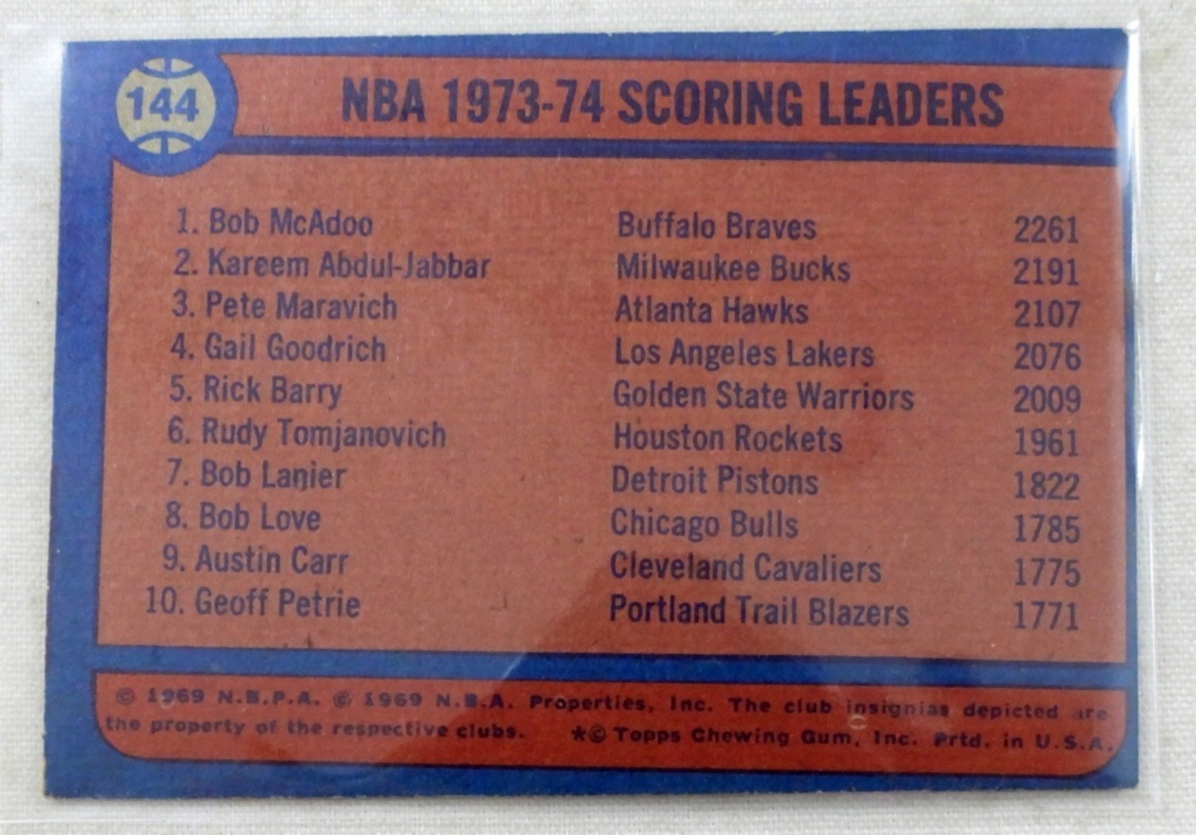 (48)1974-75 TOPPS NBA BASKETBALL CARDS #144 LEADERS KAREEM ABDUL-JABBAR & MORE OVERALL VG
