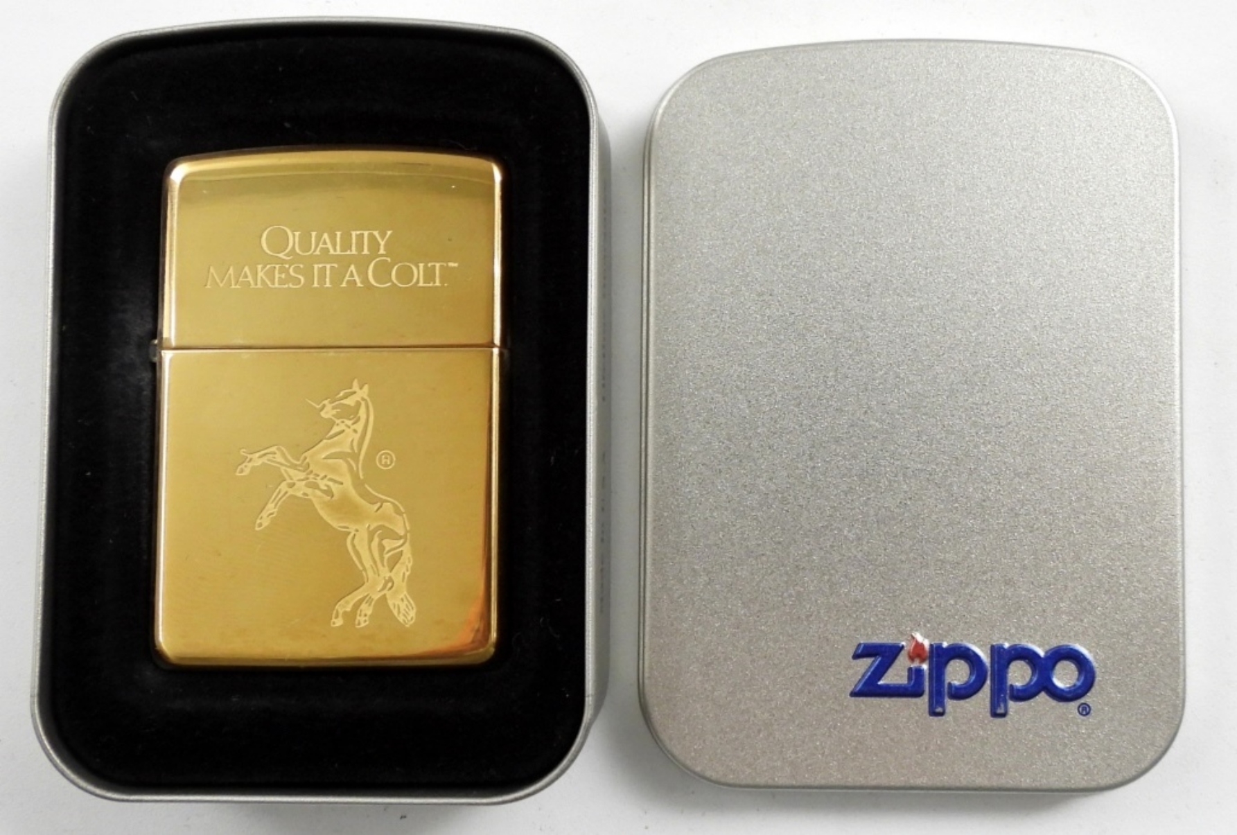 1996 SEALED/UNFIRED QUALITY MAKES IT A COLT BRASS ZIPPO IN ORIGINAL TIN AND SLEEVE