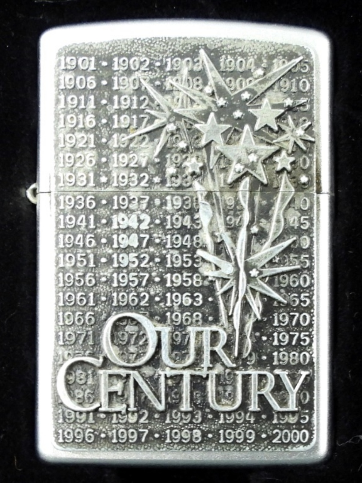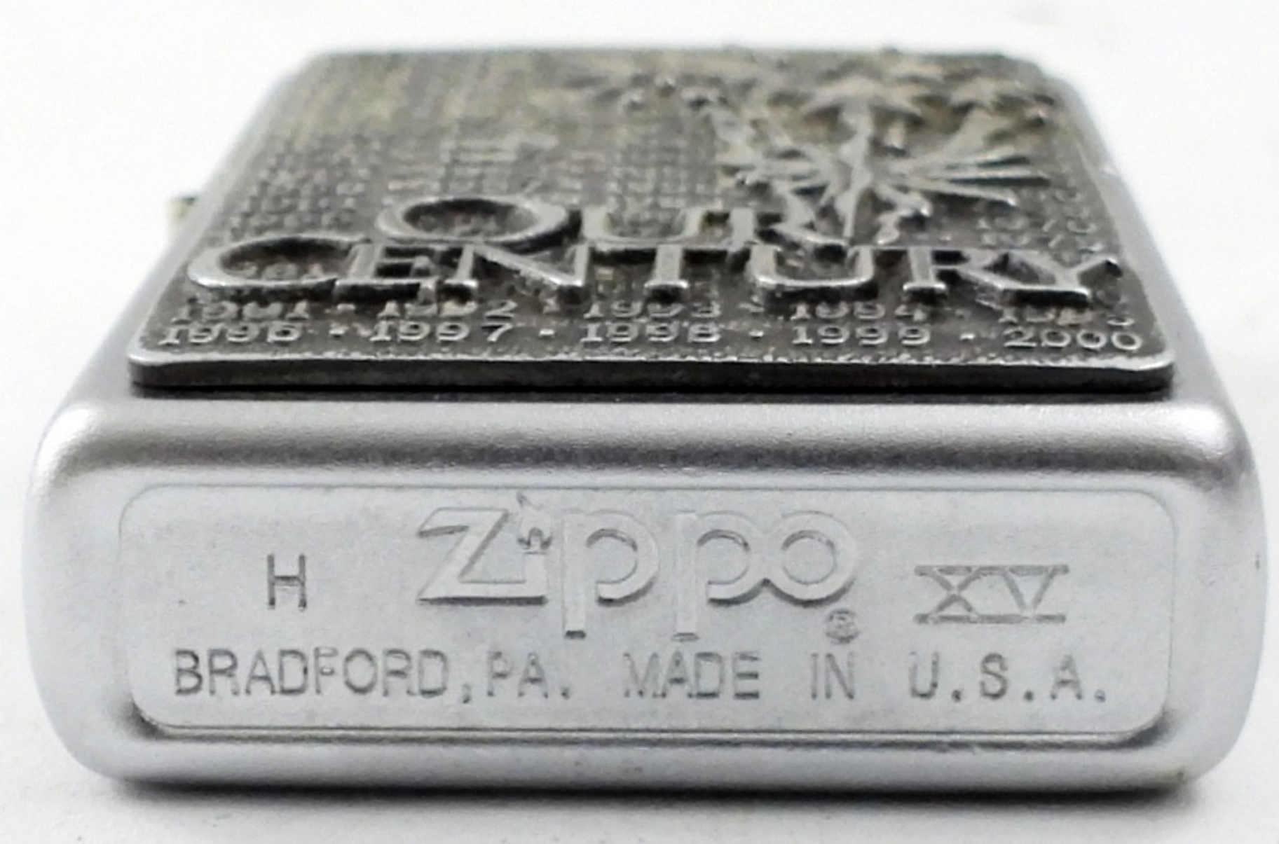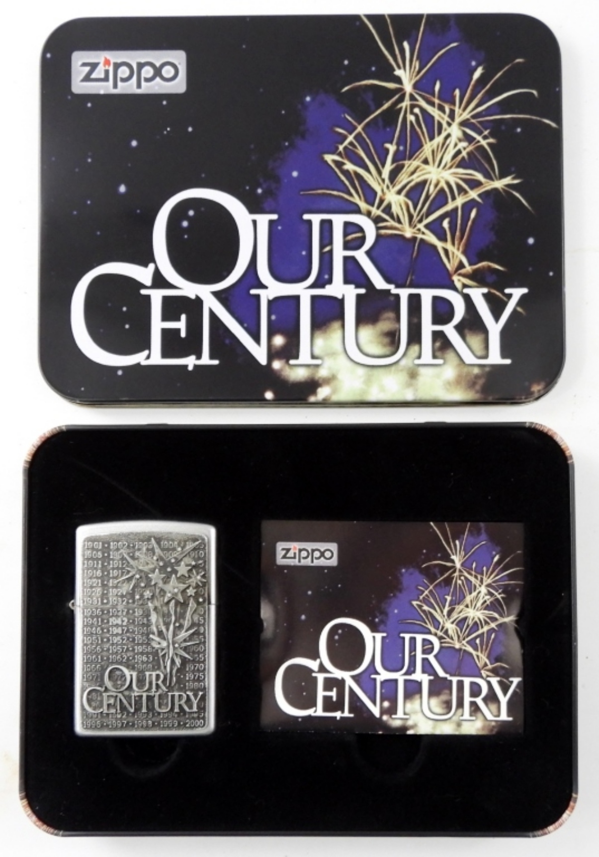 1999 FIRED OUR CENTURY SATIN CHROME ZIPPO IN ORIGINAL COLLECTORS TIN WITH SLEEVE