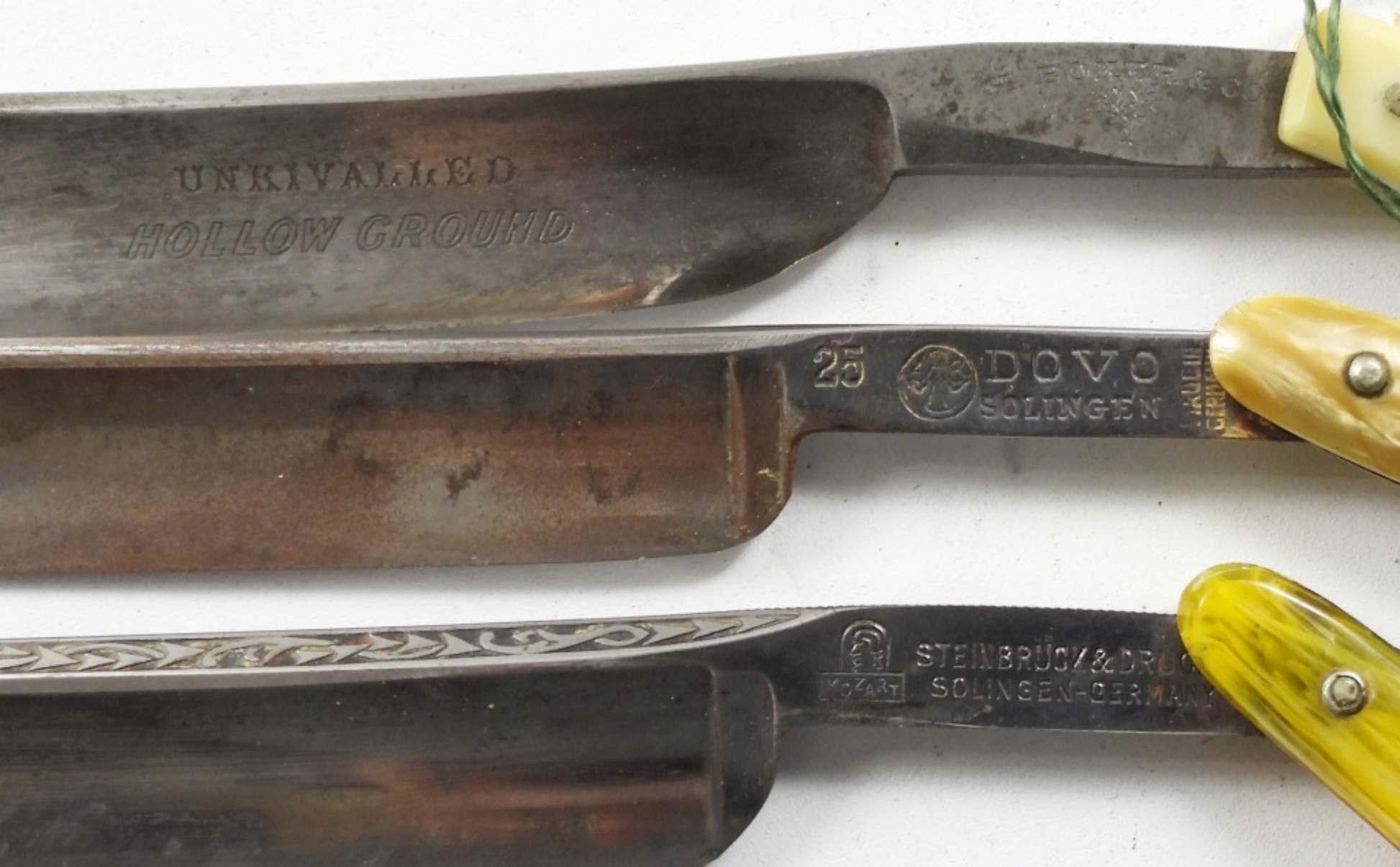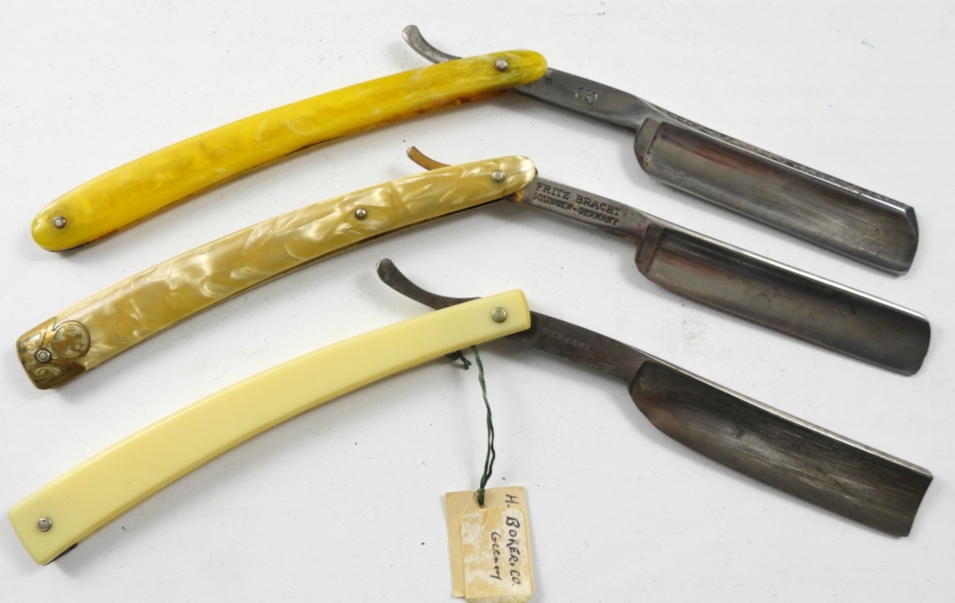 TWO SOLINGEN GERMANY STRAIGHT RAZORS, DOVO #25 FRITZ BRACHT & MOZART SPECIAL. ONE H.BOKER CO GERMANY, STRIGHT RAZOR WITH A CASE.