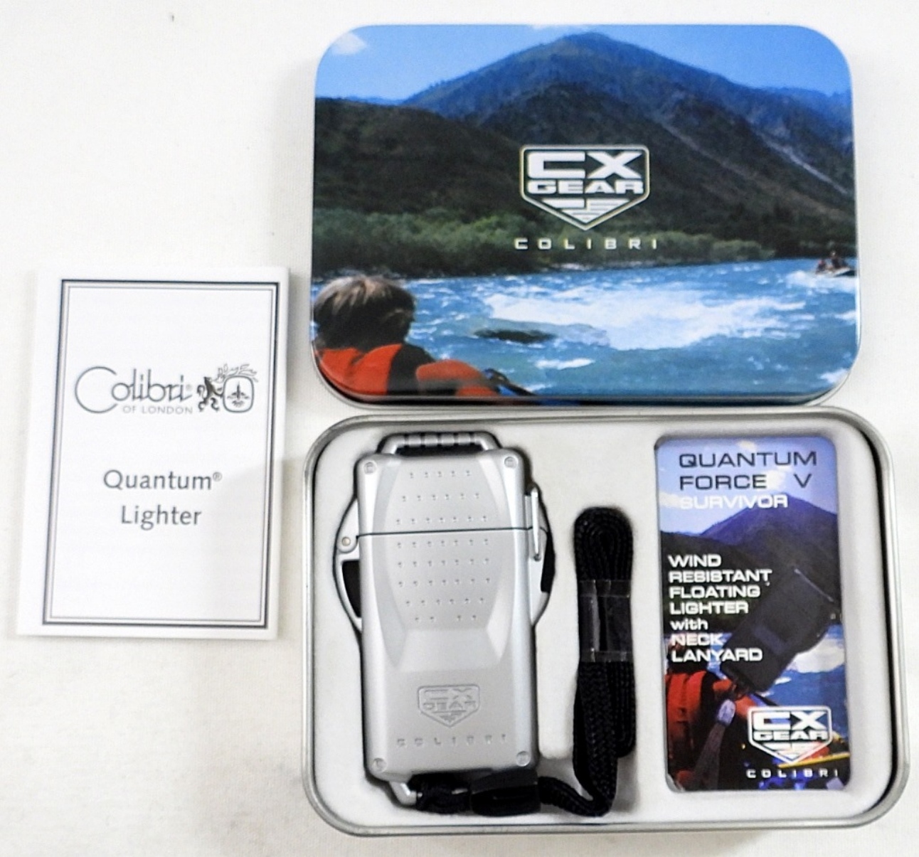 COLIBRI QUANTUM LIGHTER w/ NECK LANYARD , WIND RESISTANT FLOATING LIGHTER IN TIN