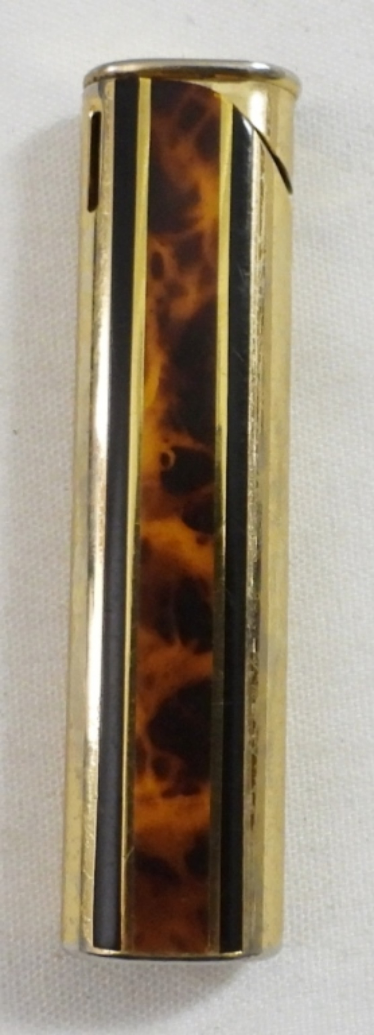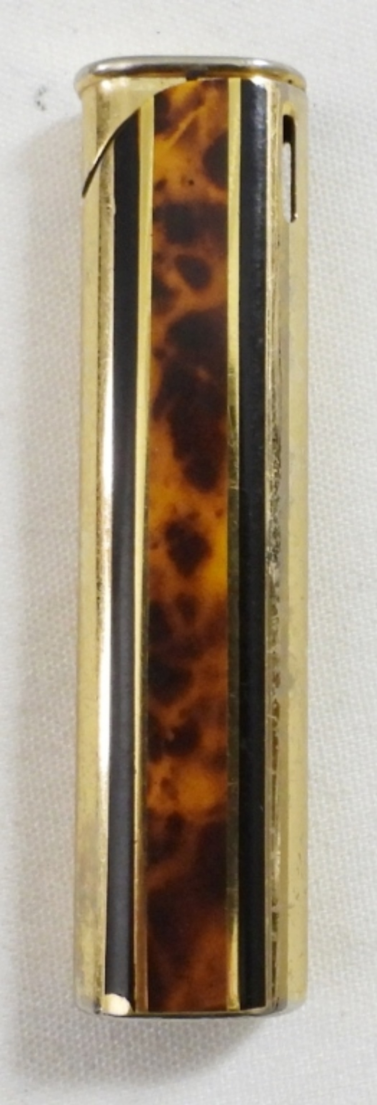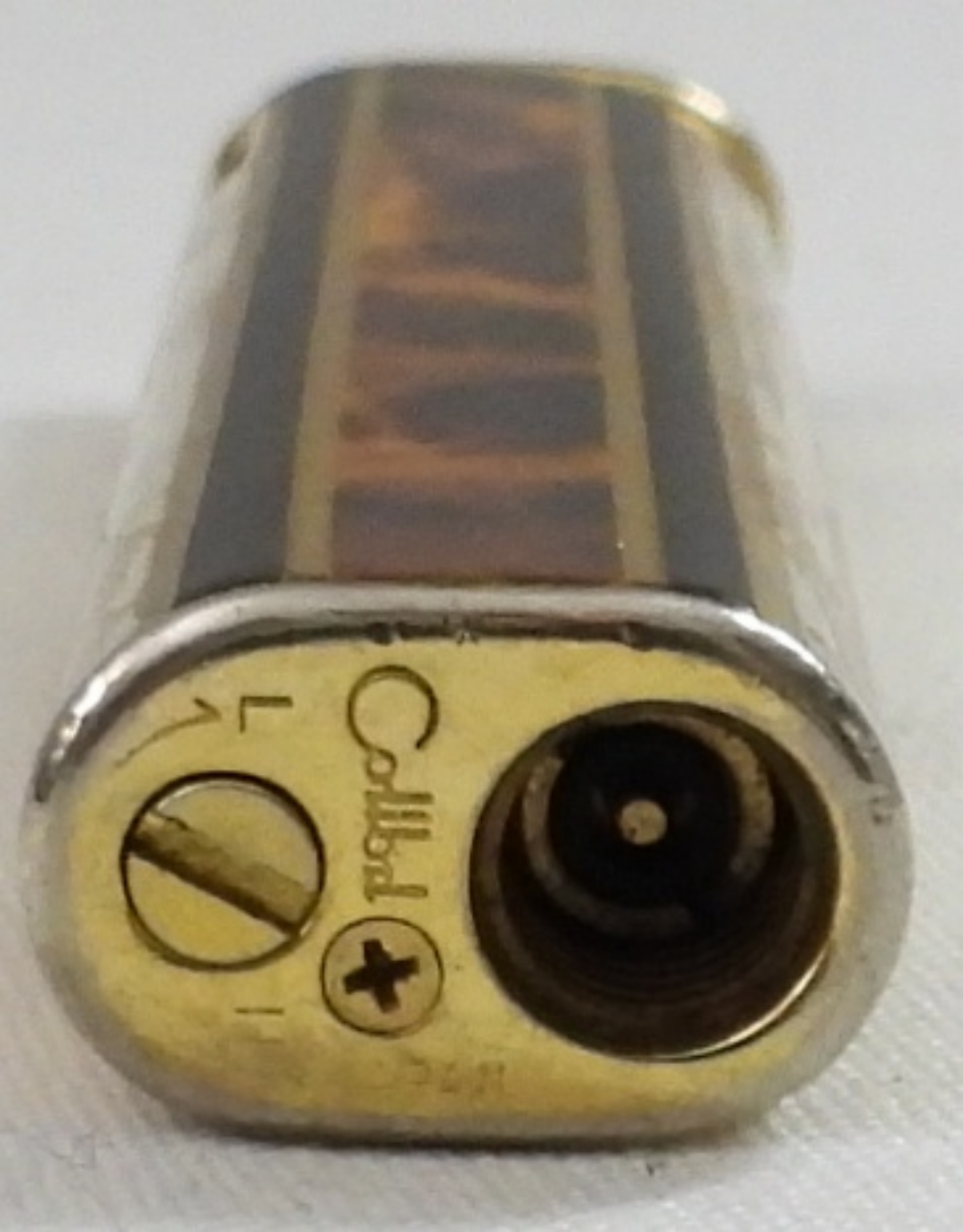 VINTAGE COLIBRI ELECTRO-QUARTZ LIGHTER,GOLD TONE WITH WOOD ACCENT, IN A BLUE CASE