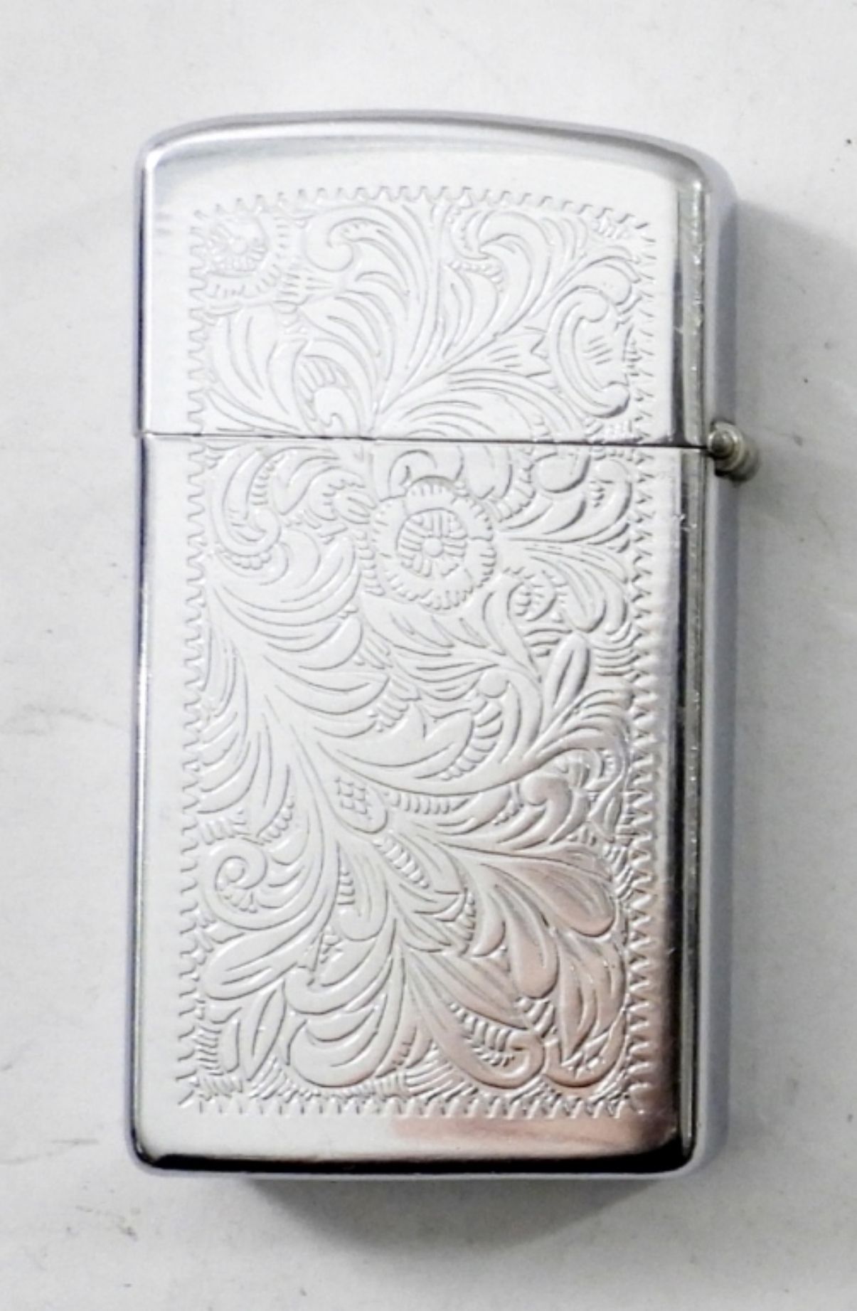 1991 FIRED SLIM CHROME VENETIAN ZIPPO LIGHTER IN ORIGINAL BOX. MODEL #1652
