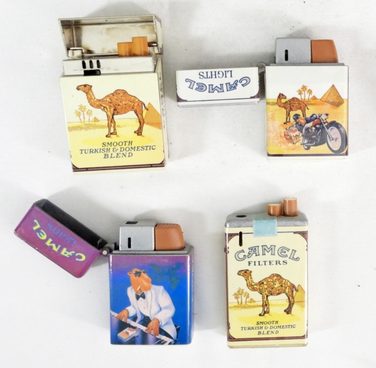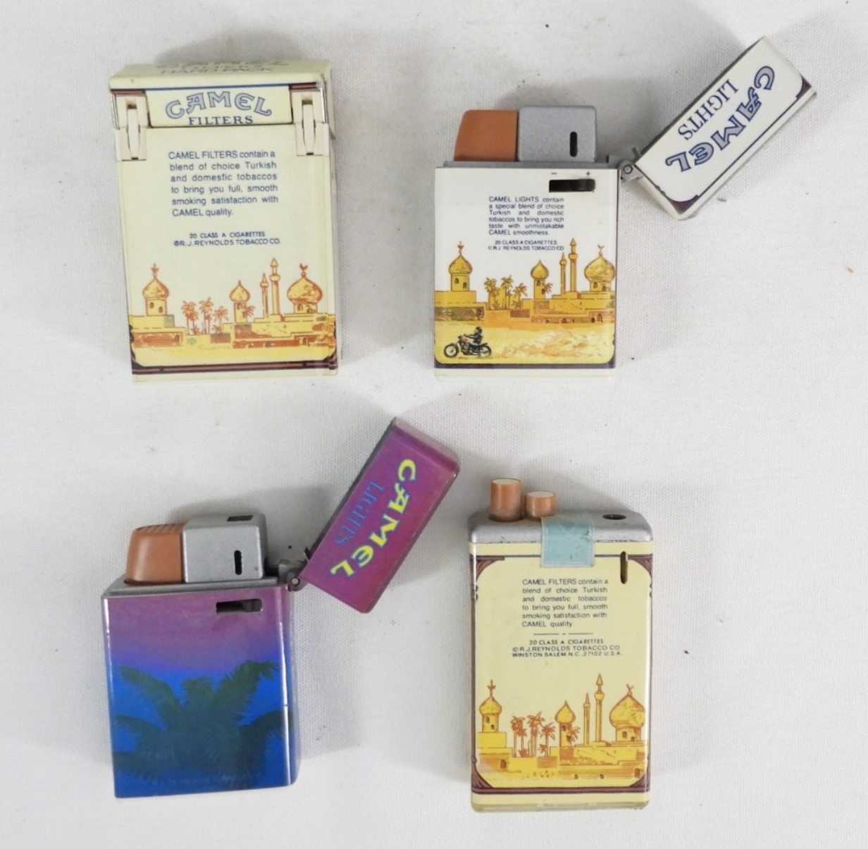 (4) BUTANE CAMEL ADVERT. LIGHTERS (2) SMOKIN JOE CAMEL LIGHTS BUTANE LIGHTERS, (2) CAMEL FILTERS CIG PACK BUTANE LIGHTERS