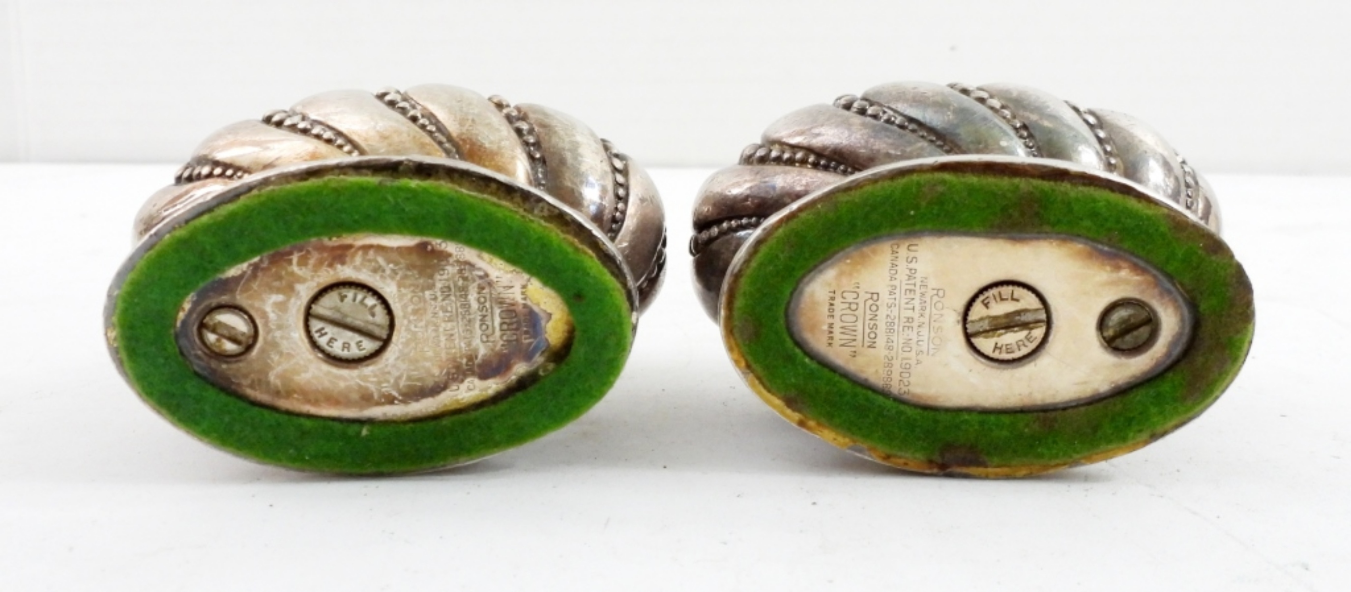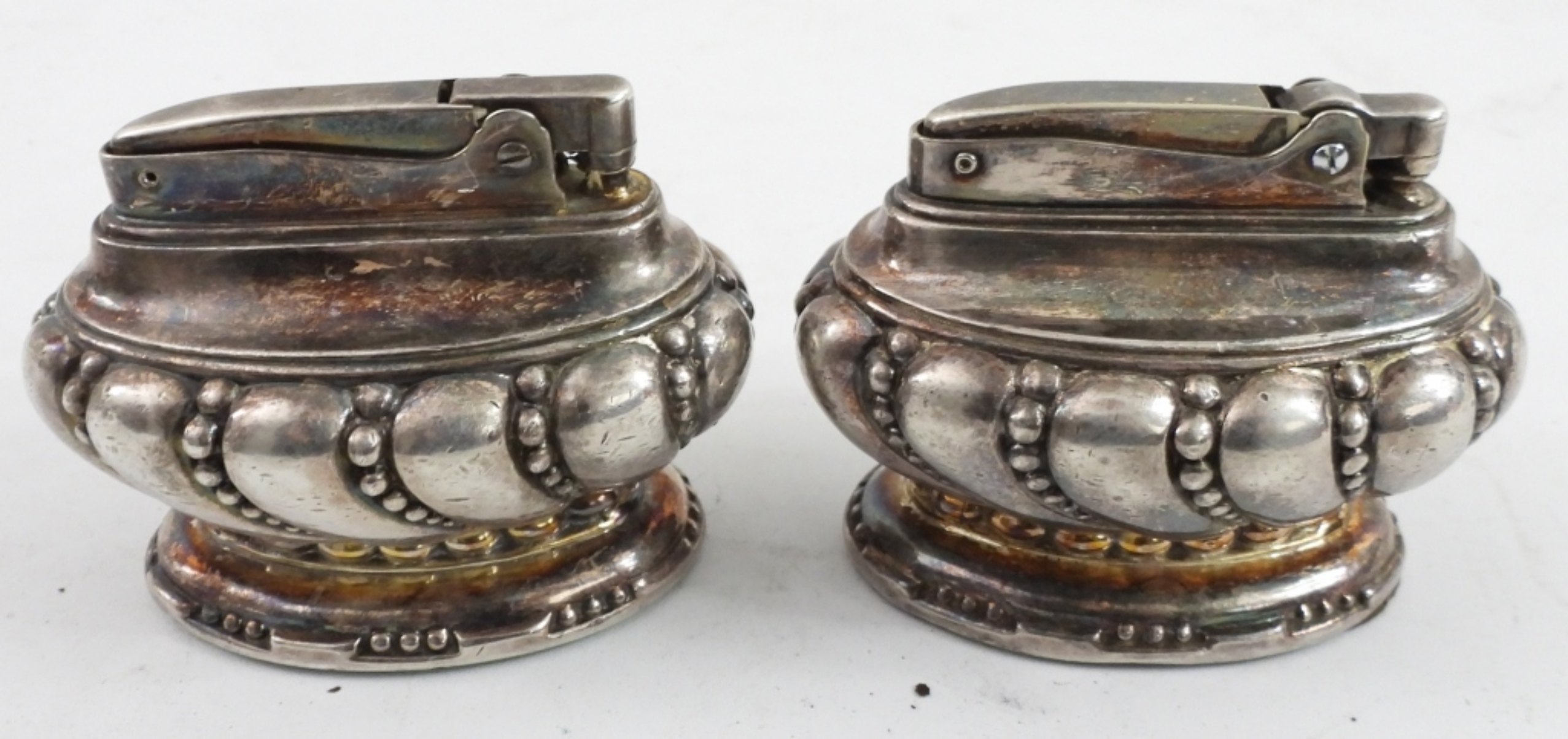 TWO RONSON CROWN TABLE TOP LIGHTERS, SILVER TONE.