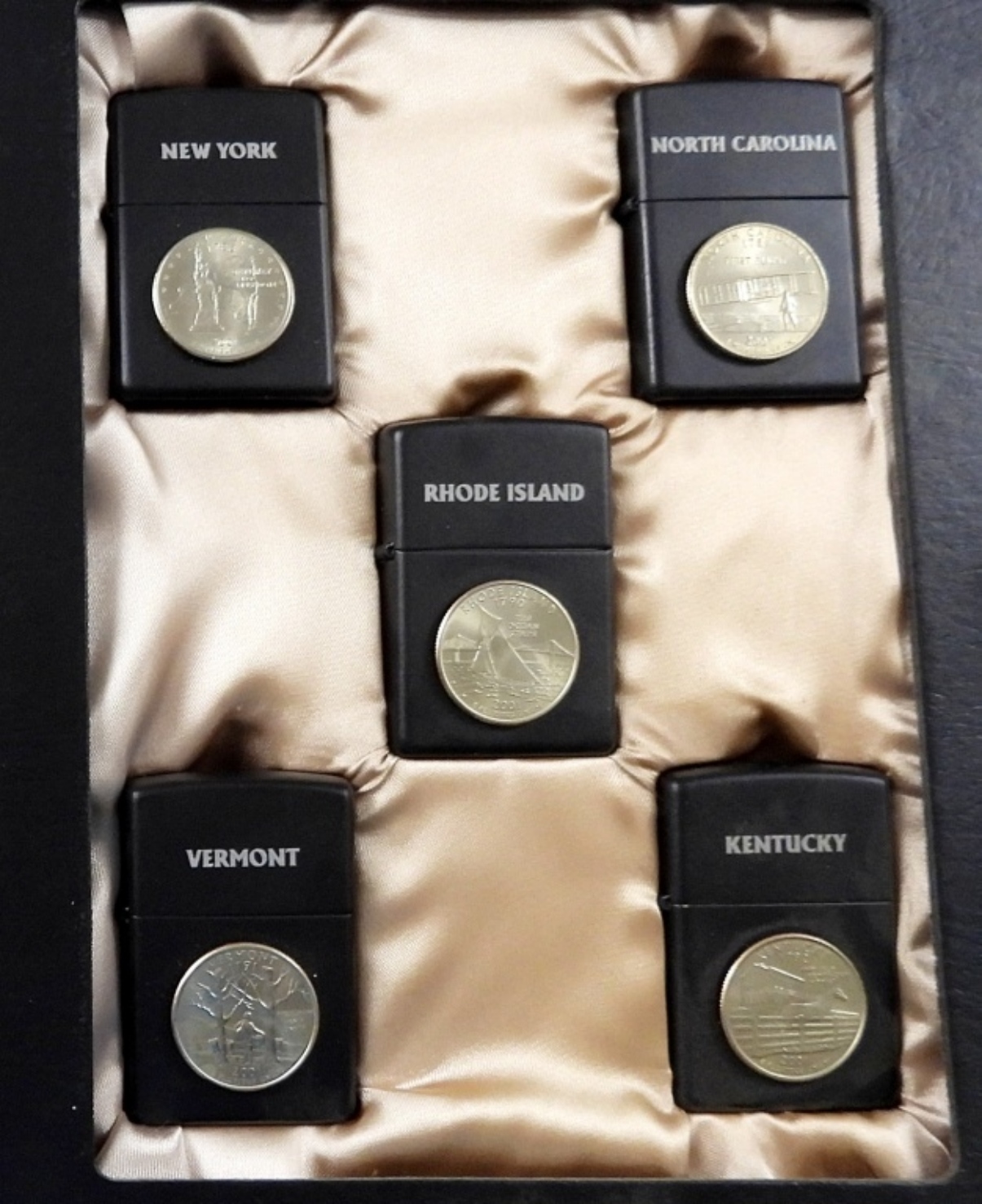 5 ZIPPOS 4 SEALED AND 1 UNFIRED ,IN A SATIN BLACK COLLECTORS BOX. NEW YORK, NORTH CAROLINA, RHODE ISLAND, KENTUCKY, AND VERMONT