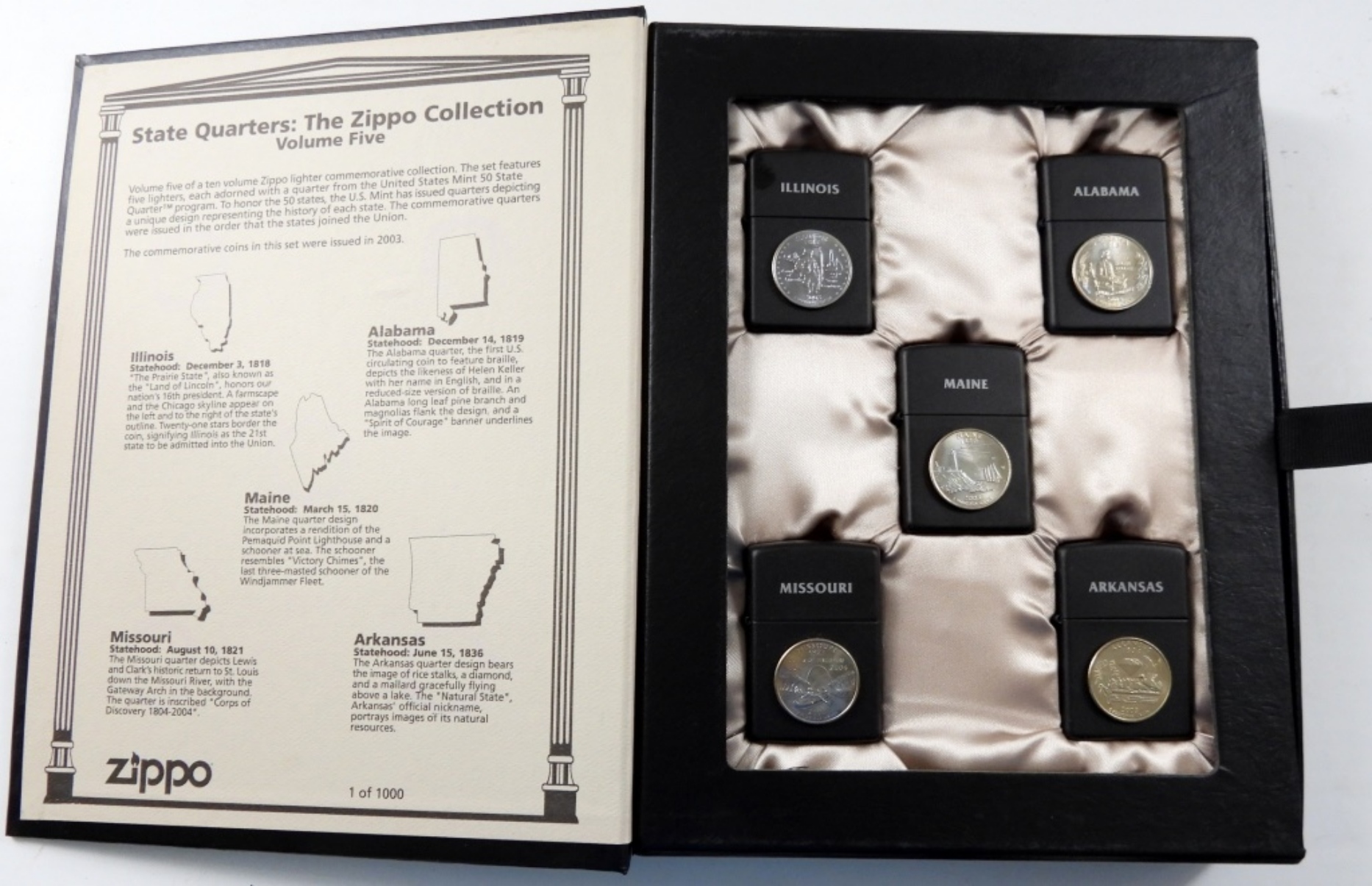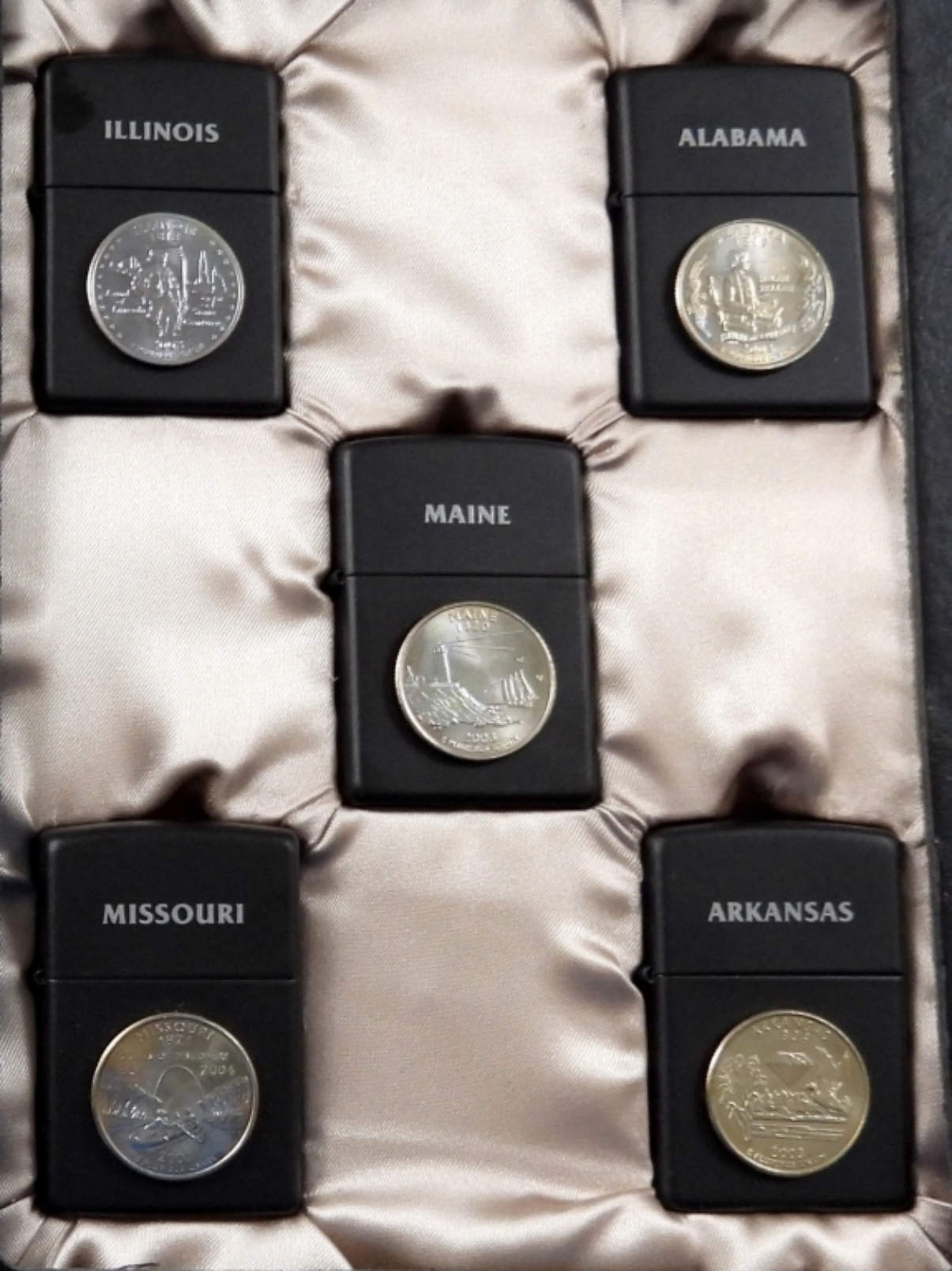 ALL ZIPPOS ARE SEALED IN ORIGINAL BLACK AND SATIN CASE, ALABAMA, ILLINOIS, MAINE, MISSOURI, ARKANSAS