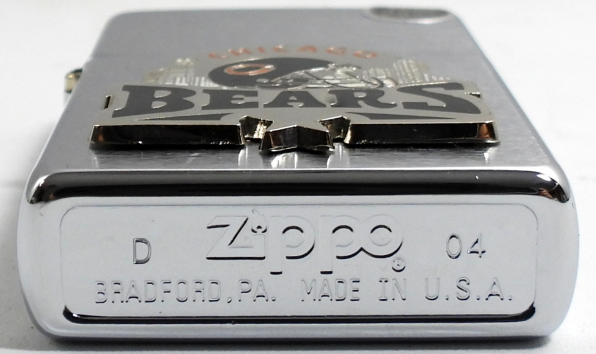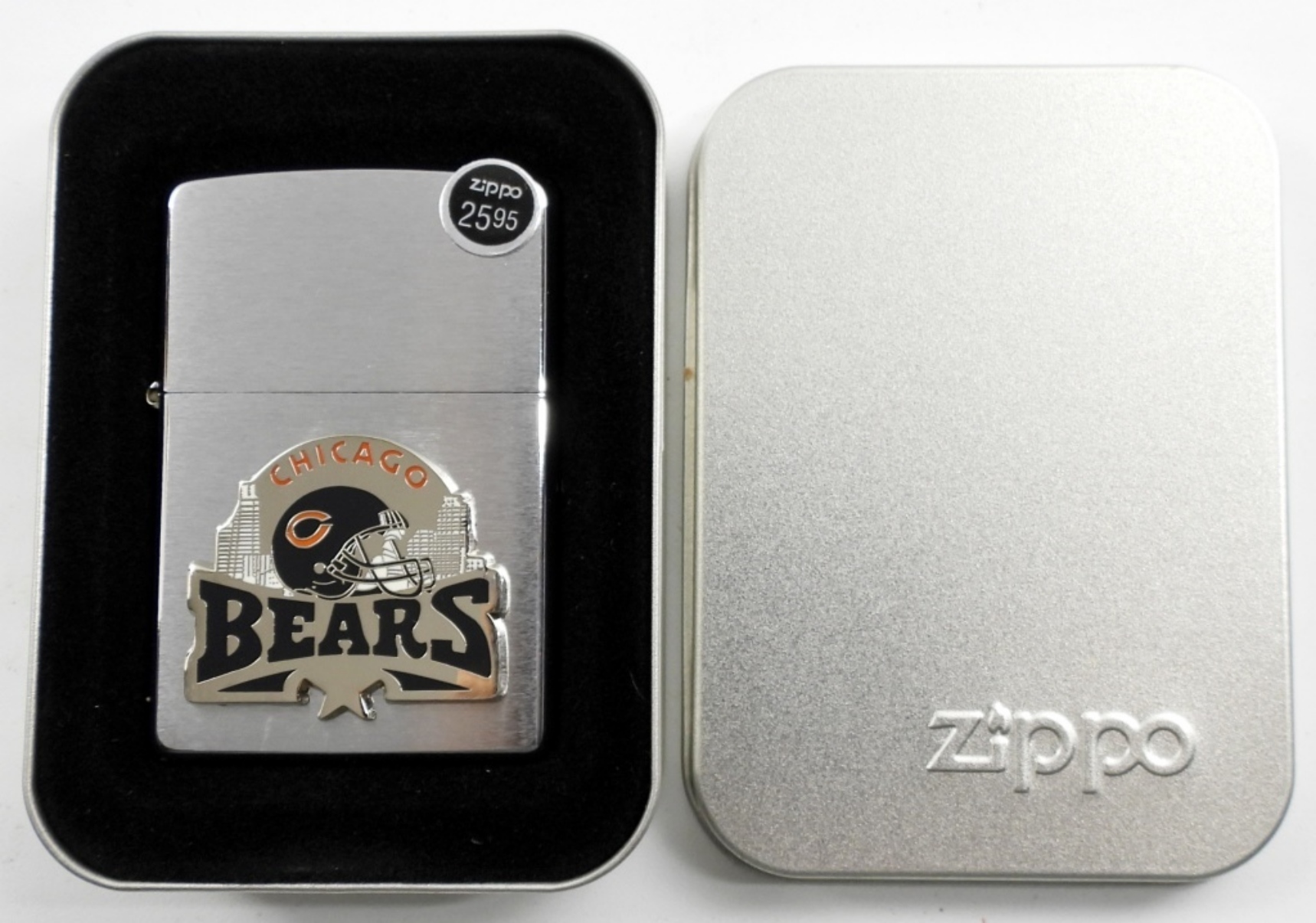 2004 SEALED /UNFIRED NFL CHICAGO BEARS RAISED EMBLEM CHROME ZIPPO LIGHTER IN ORIGINAL TIN AND SLEEVE