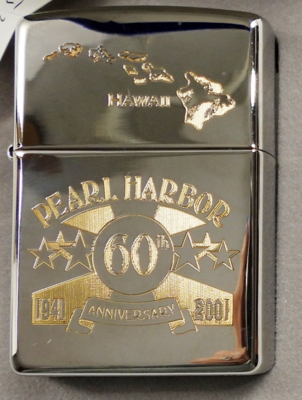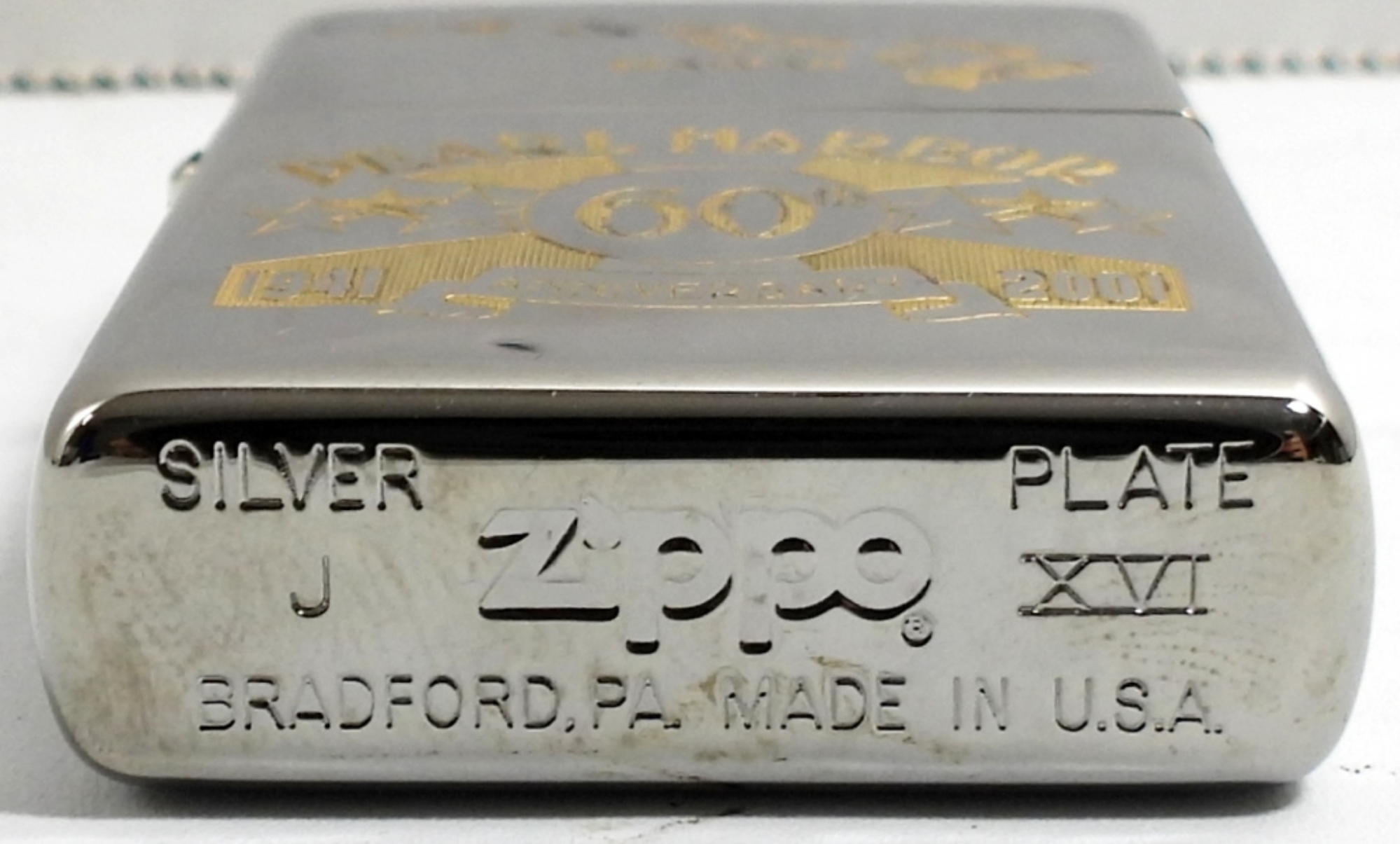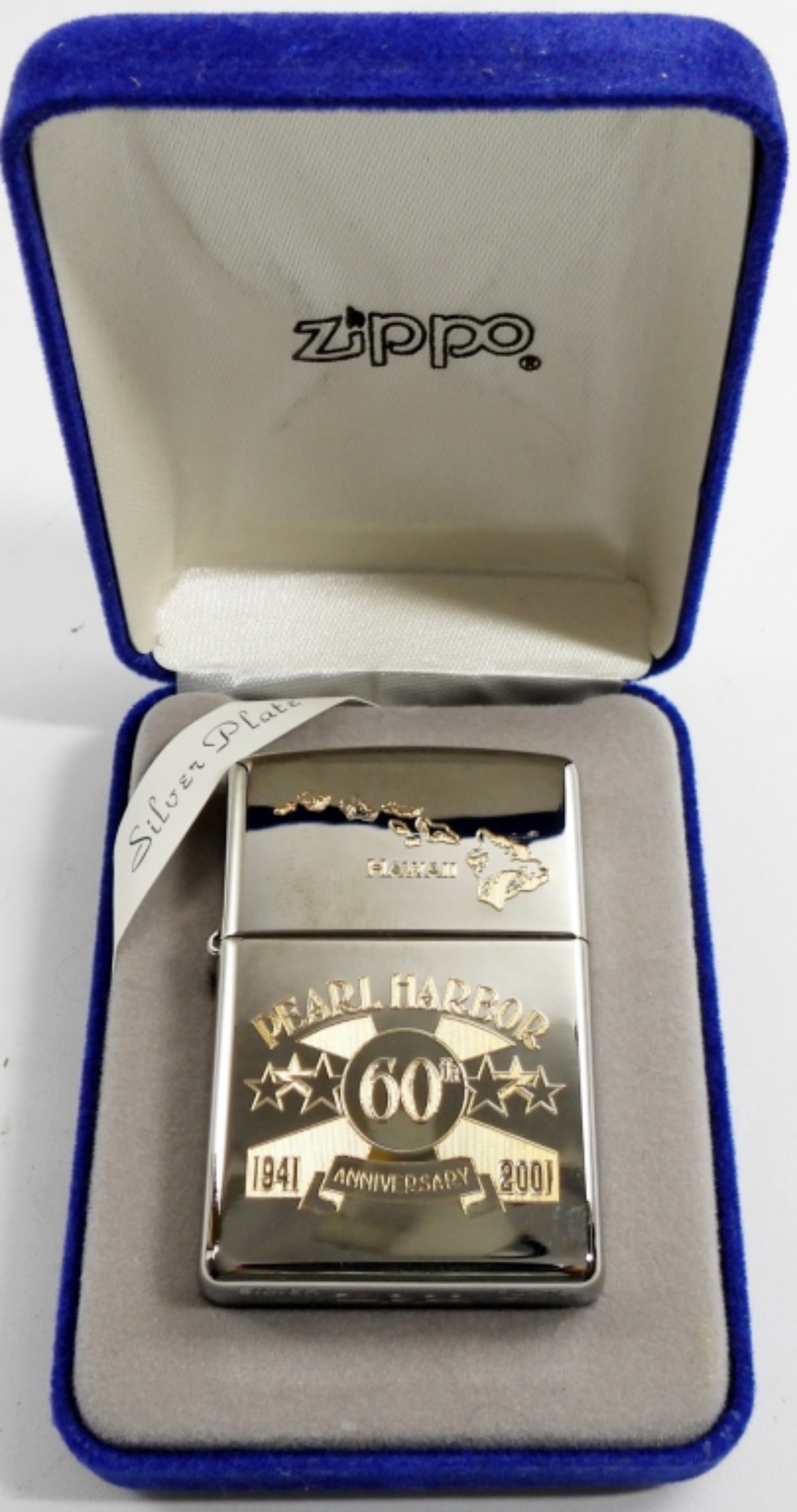 2000 SEALED/UNFIRED SILVER PLATED(SPECIAL INLAID) HAWAII PEARL HARBOR 60TH ANNIVERSARY 1941-2001 ZIPPO IN A BLUE VELVET CASE AND SLEEVE