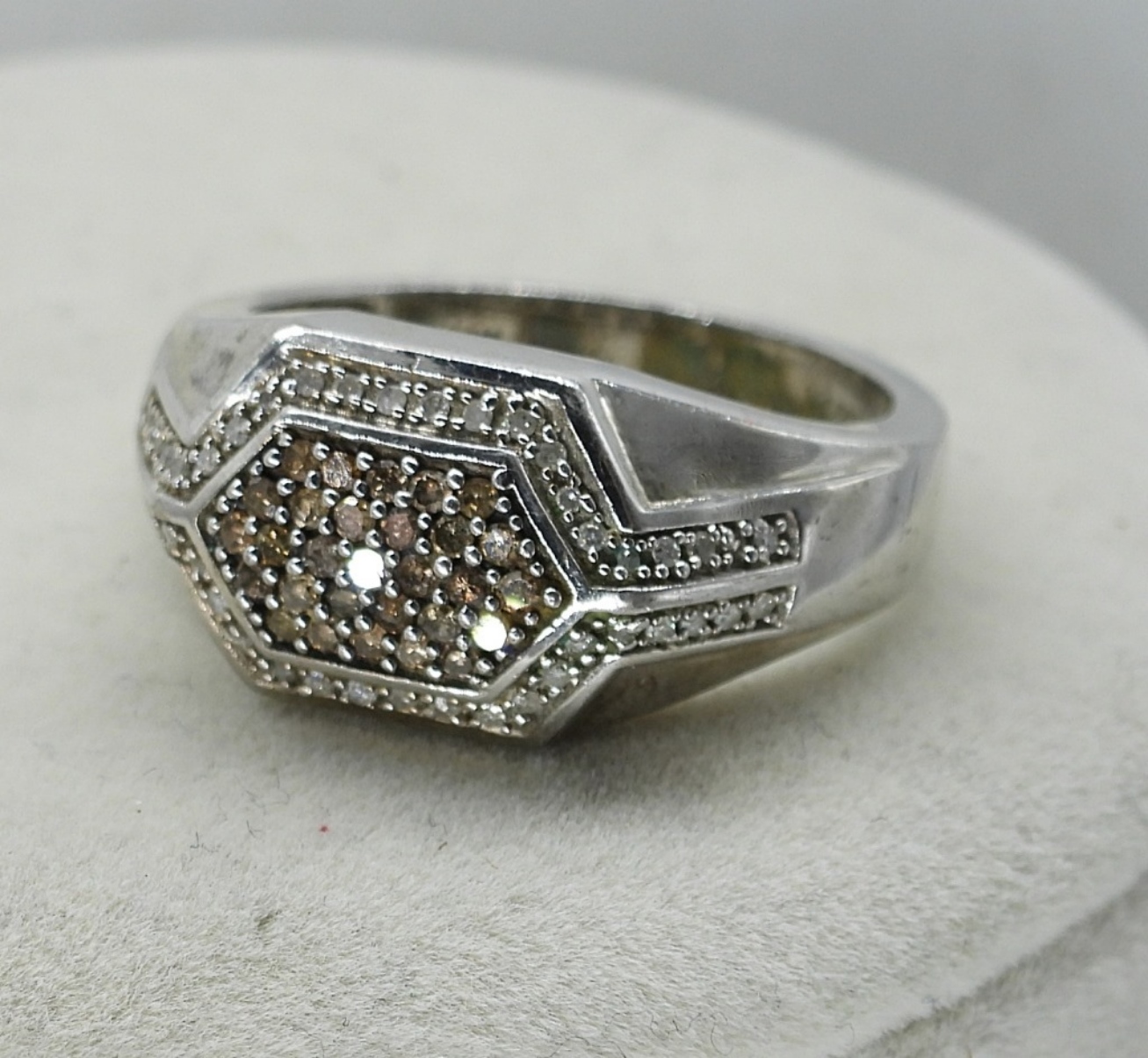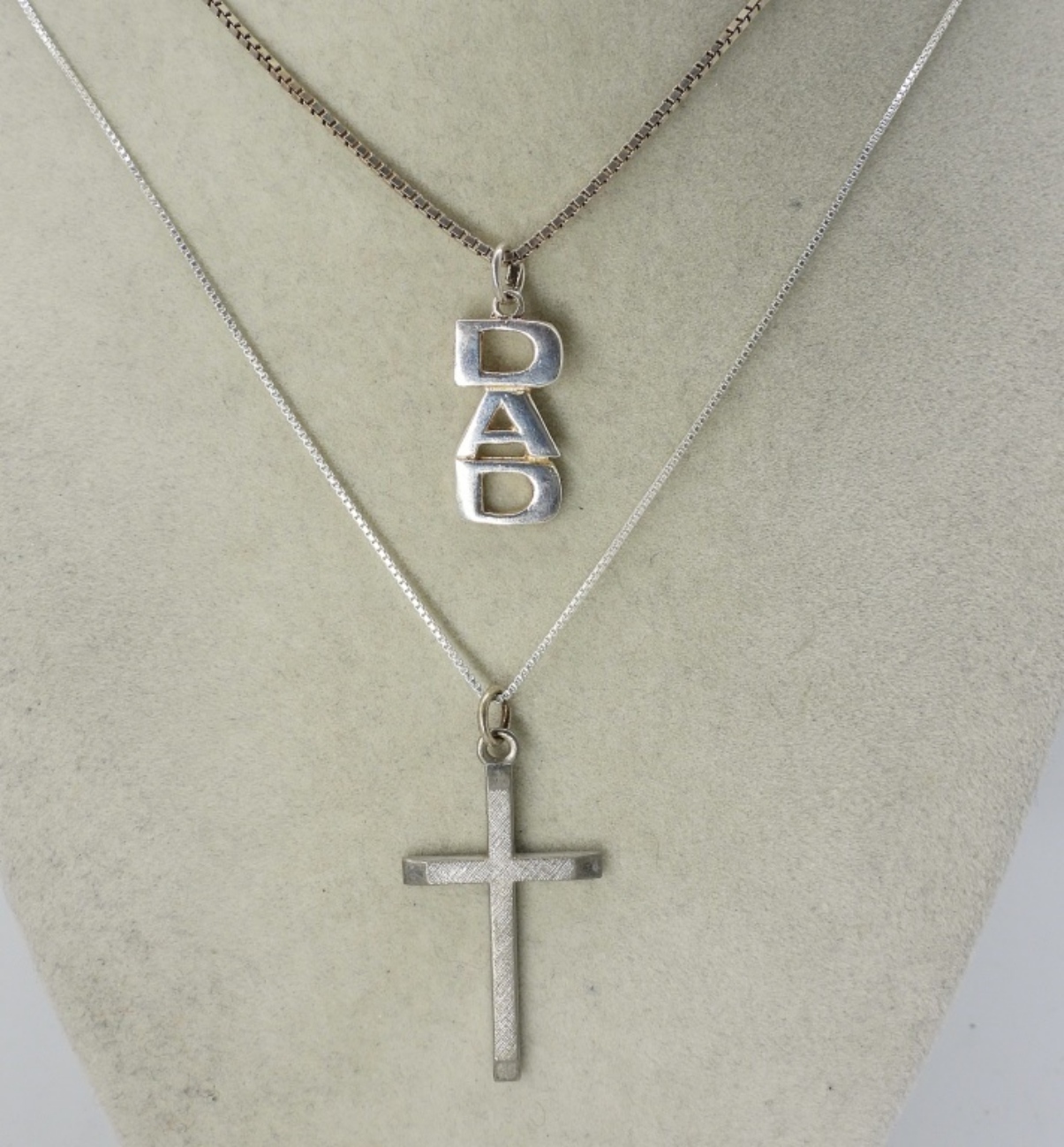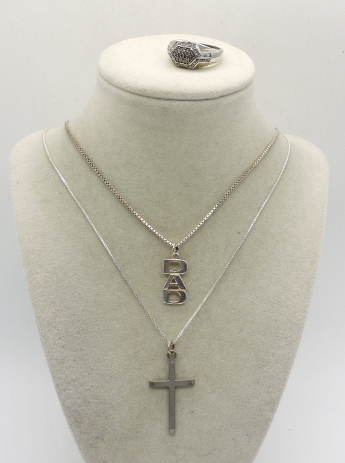 RING IS SIZE 12, DIAMOND & MOISSANITE GEMSTONES. STERLING “DAD” NECKLACE, 29″. CROSS NECKLACE, 18″. 12.8DWT