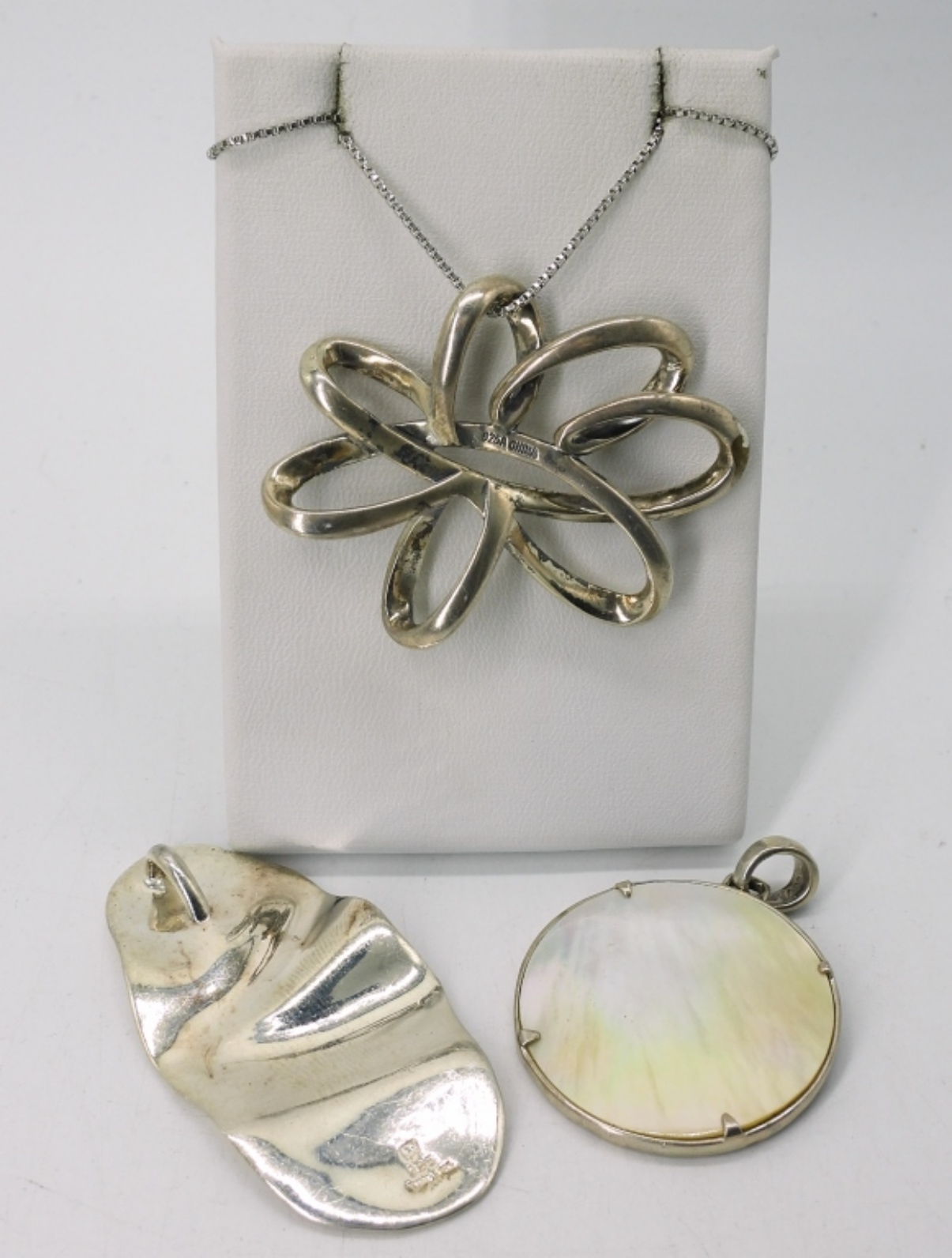 THREE BEAUTIFUL MARCASITE, GEMSTONE, MOTHER OF PEARL PENDANTS. ONE STERLING CHAIN, 22″. 31.7 DWT