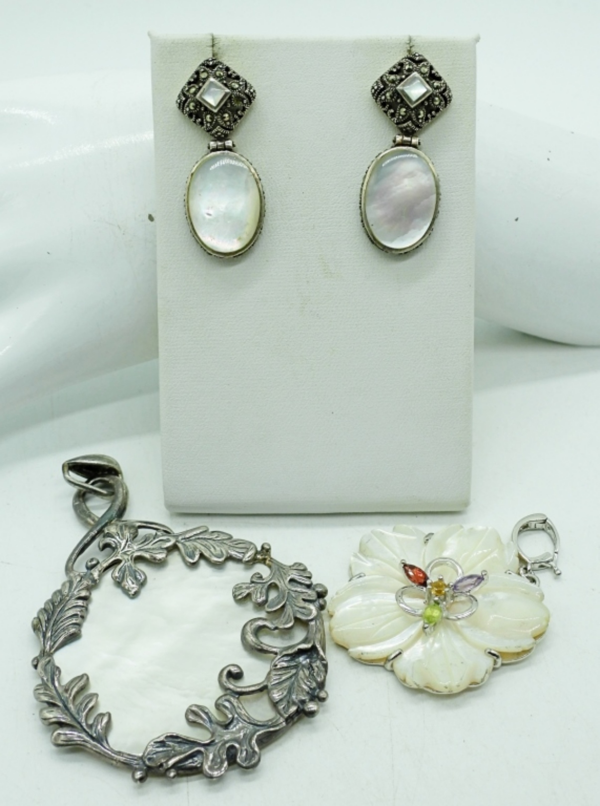 TWO MOTHER OF PEARL & STERLING PENDANTS, 2: & 3″. ONE PAIR OF STERLING MOTHER OF PEARL PIERCED EARRINGS. 21.6 DWT