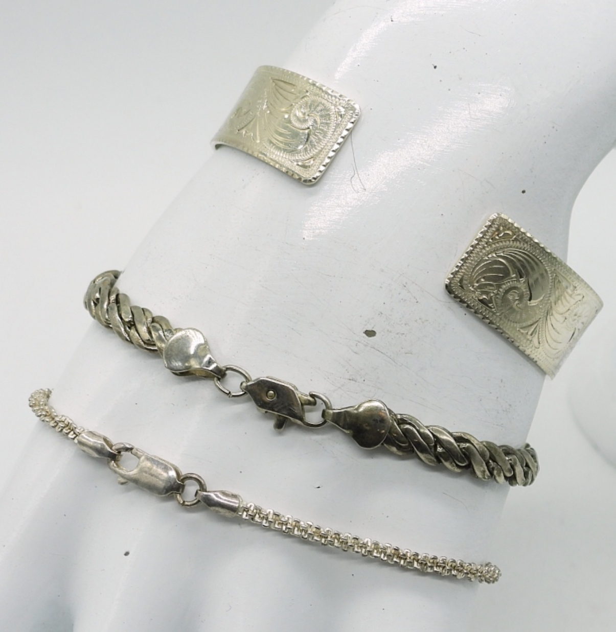 THREE STERLING FASHION BRACELETS. TWO CHAIN BRACELETS, 7.5″ & 8″. CUFF 7″. 23.2 DWT