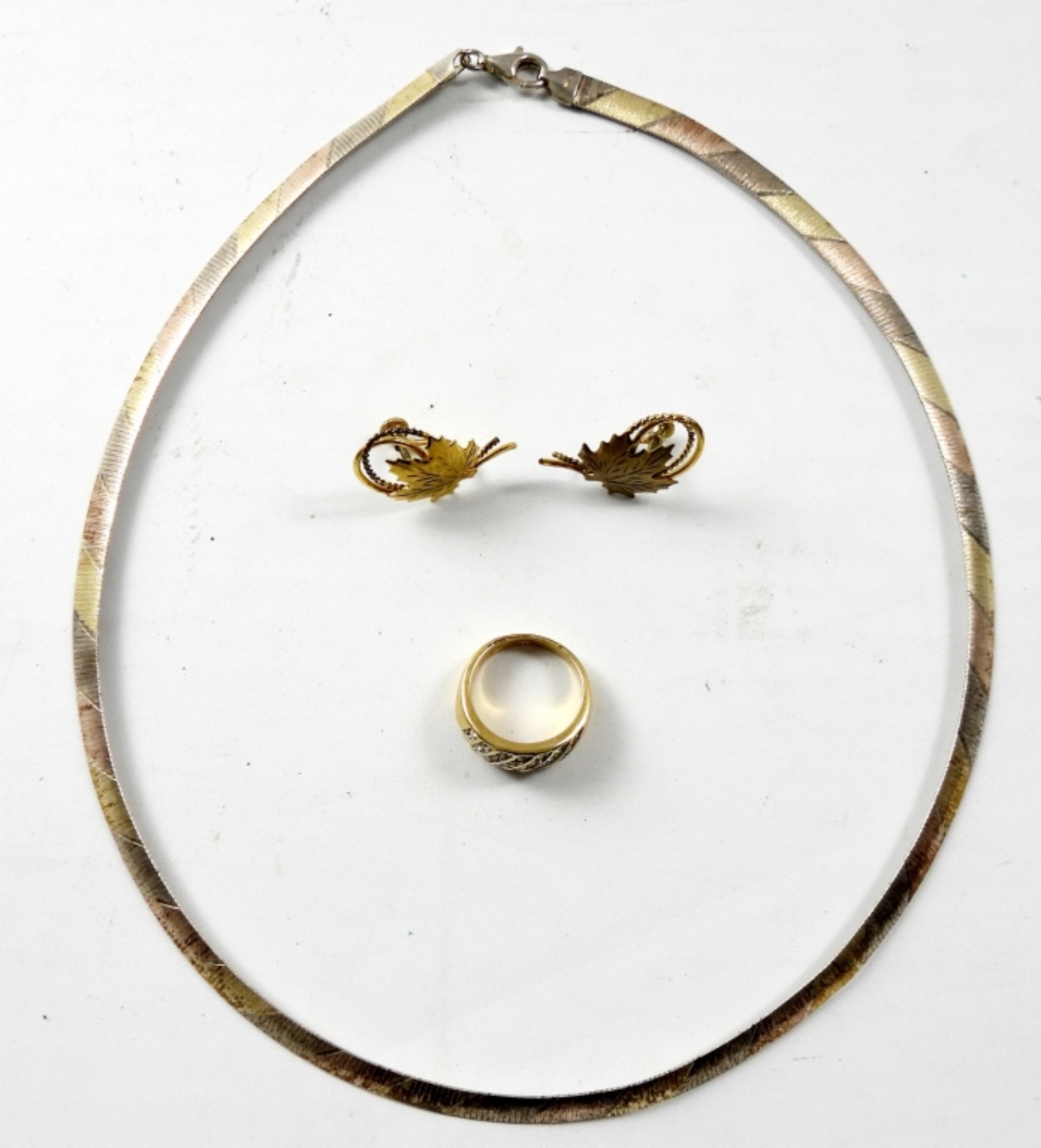 20″ 925 STERLING NECKLACE, A PAIR OF GOLD TONE LEAF CLIP ON EARRINGS AND A SIZE 8 RING WITH CLEAR GEMSTONES(22.9 DWT)