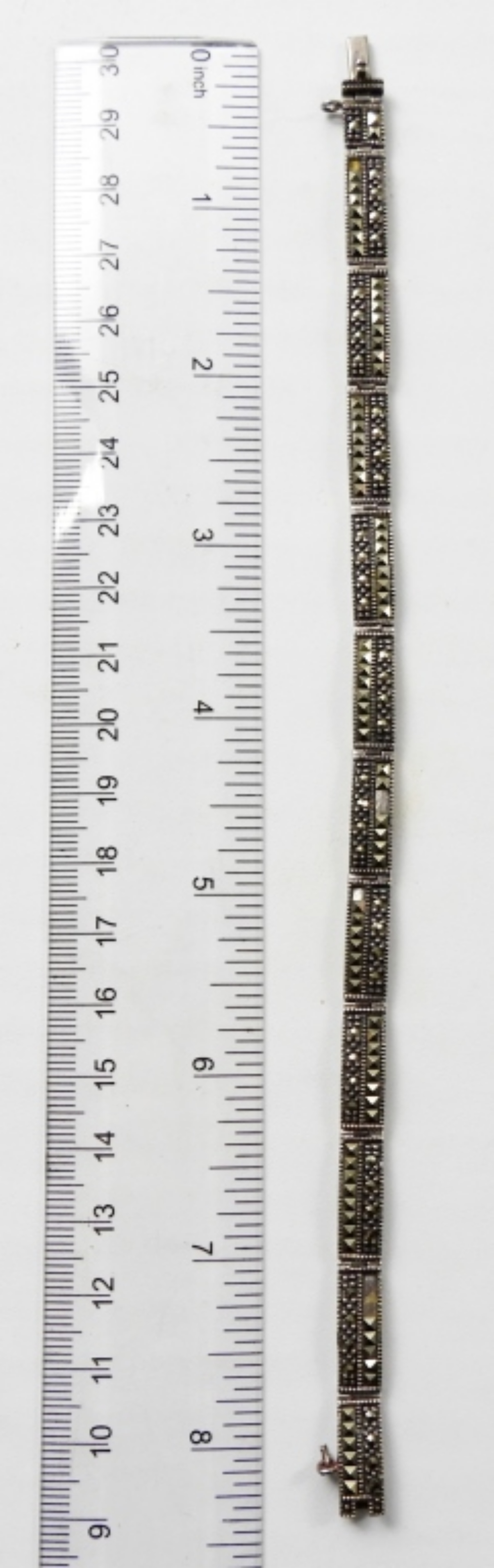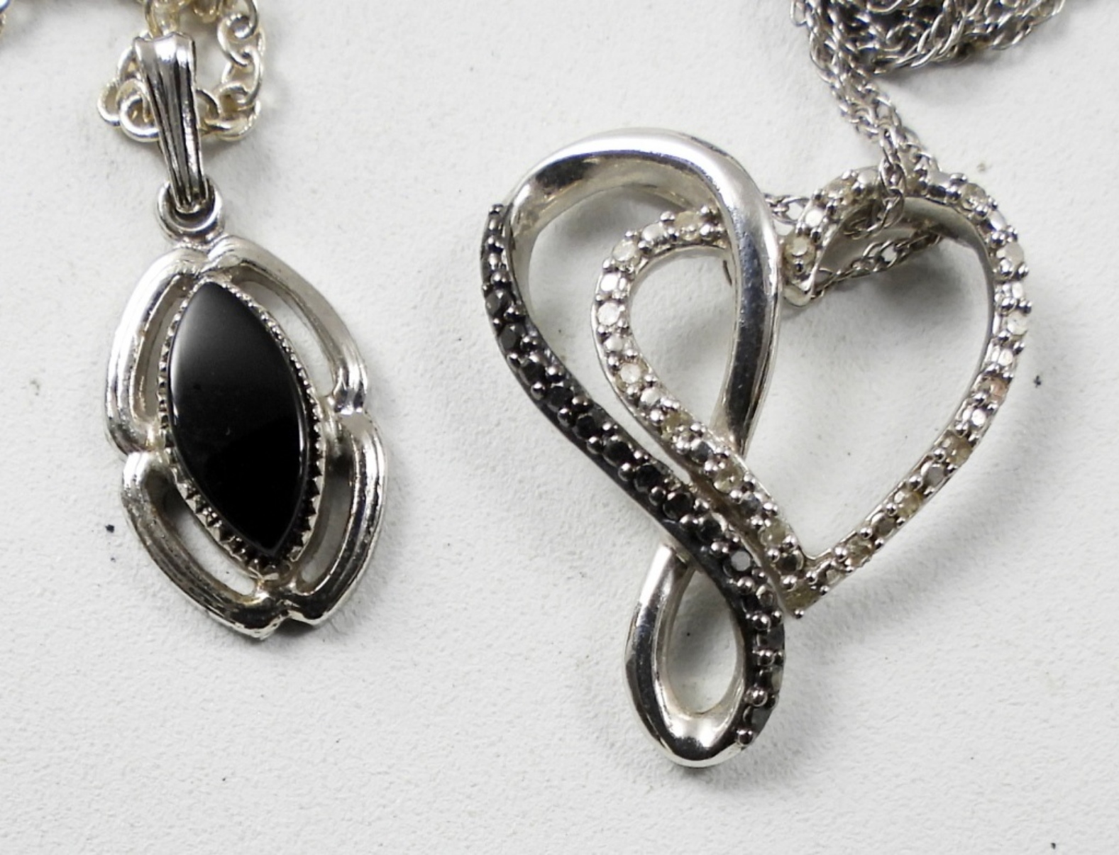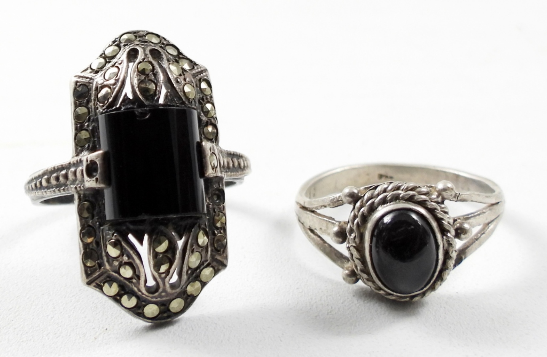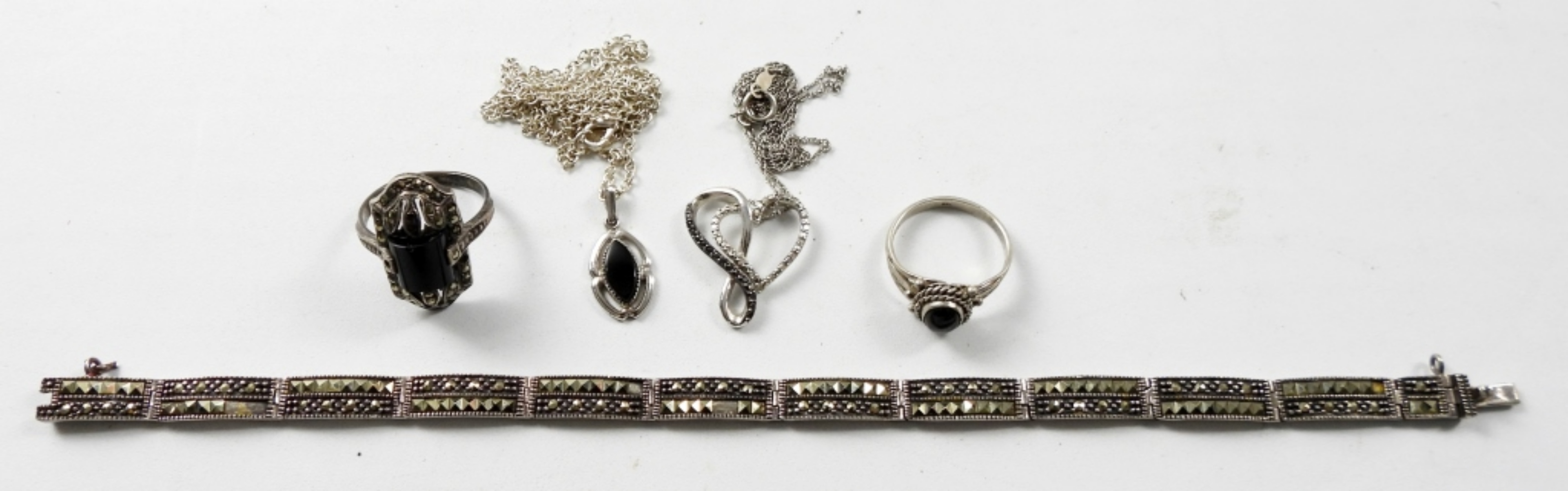 (5) PIECE VINTAGE LADIES STERLING JEWELRY LOT 18″-20″ NECKLACE EACH WITH PENDANTS, A 7″ BRACELET AND 2 RINGS SIZE 6&7 BOTH WITH ONIX STONES(19.3 DWT)
