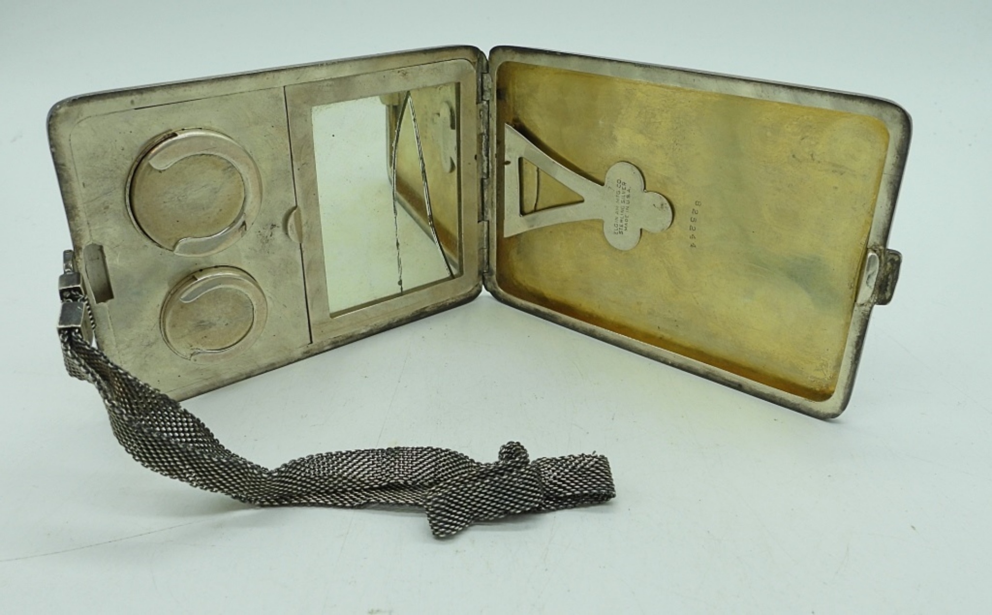 ELGIN AM MFG CO, VINTAGE STERLING COMPACT PURSE. ENGRAVED “M”. MIRROR IS CRACKED. IN GOOD SHAPE OTHER THAN THAT. 3.5″x2.5″. 5.5″ STRAP. 67.8 DWT