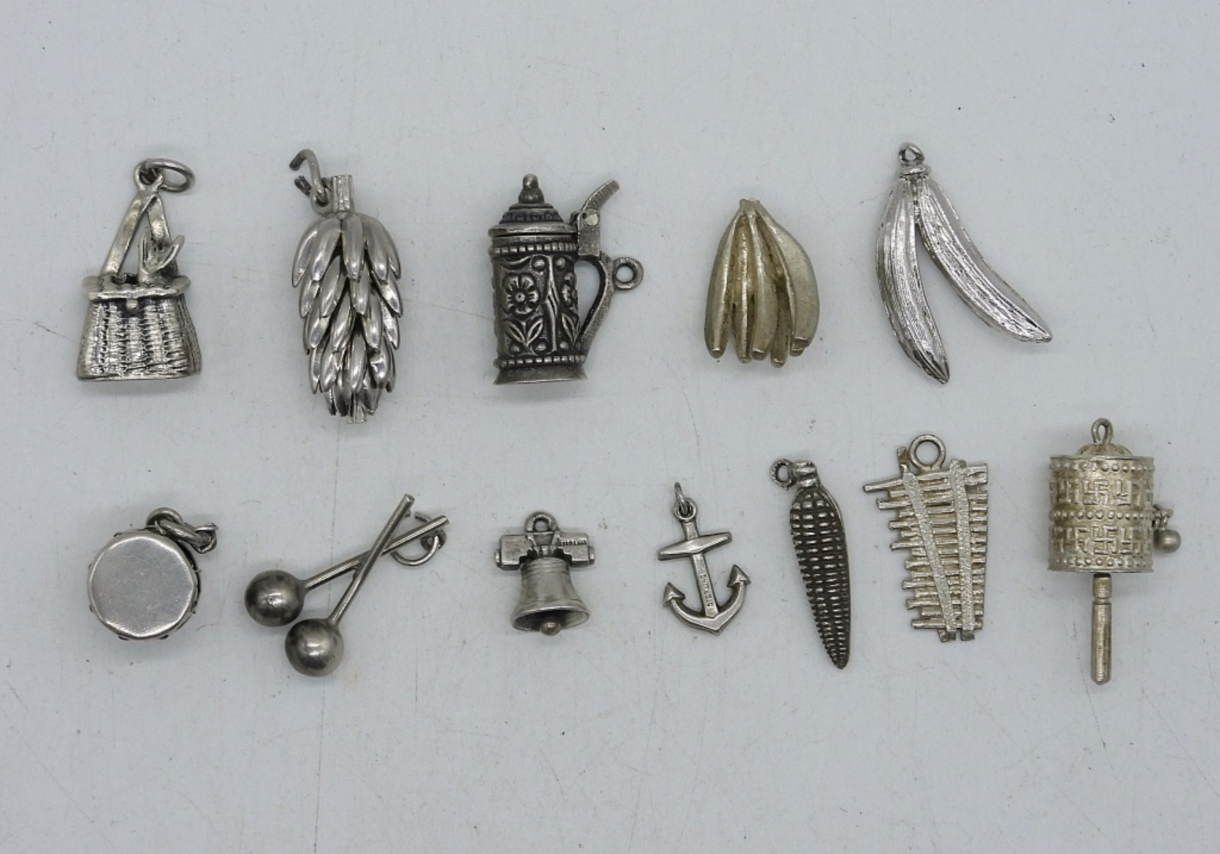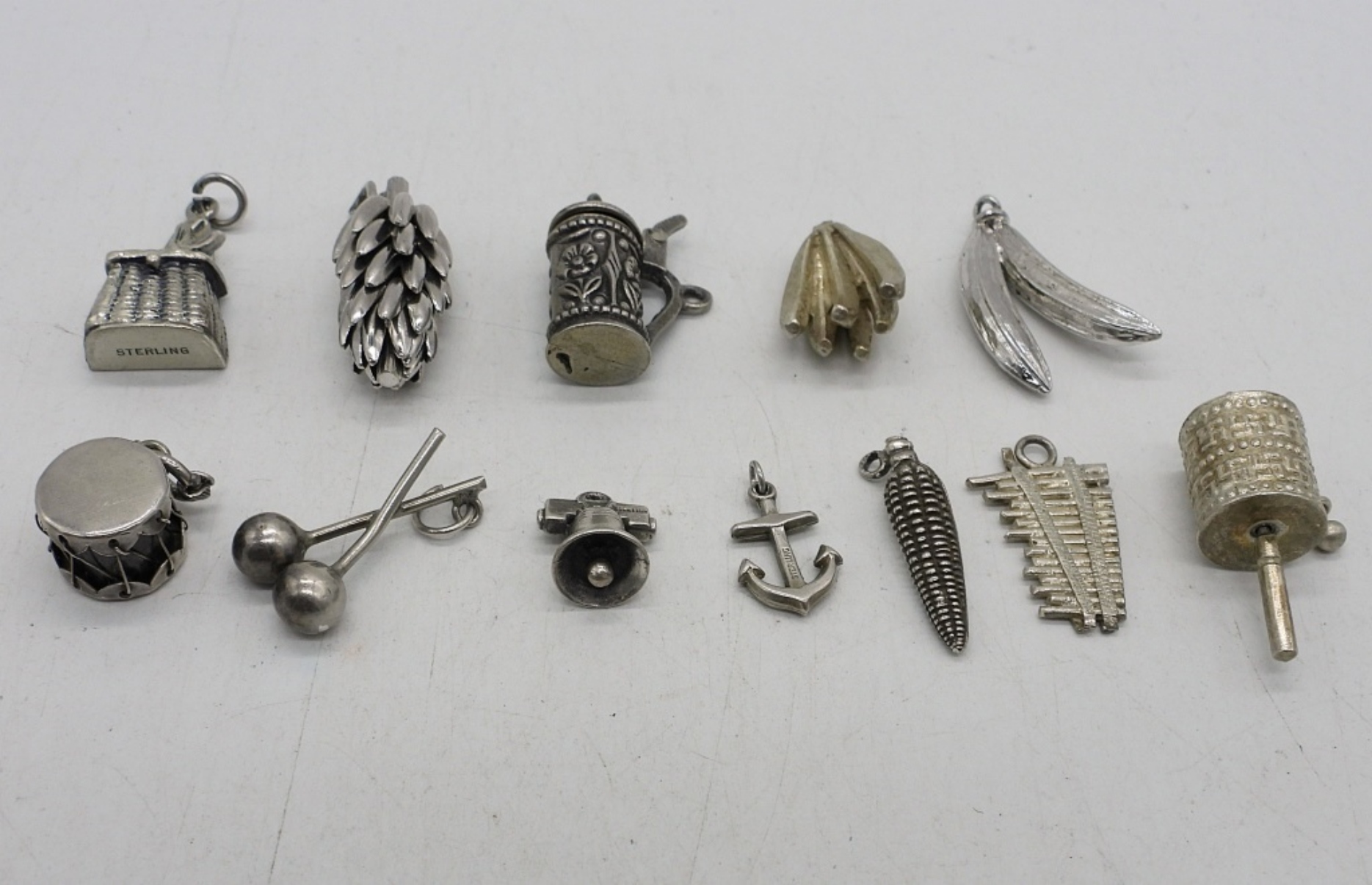 TWELVE VINTAGE STERLING CHARMS. 21.2 DWT