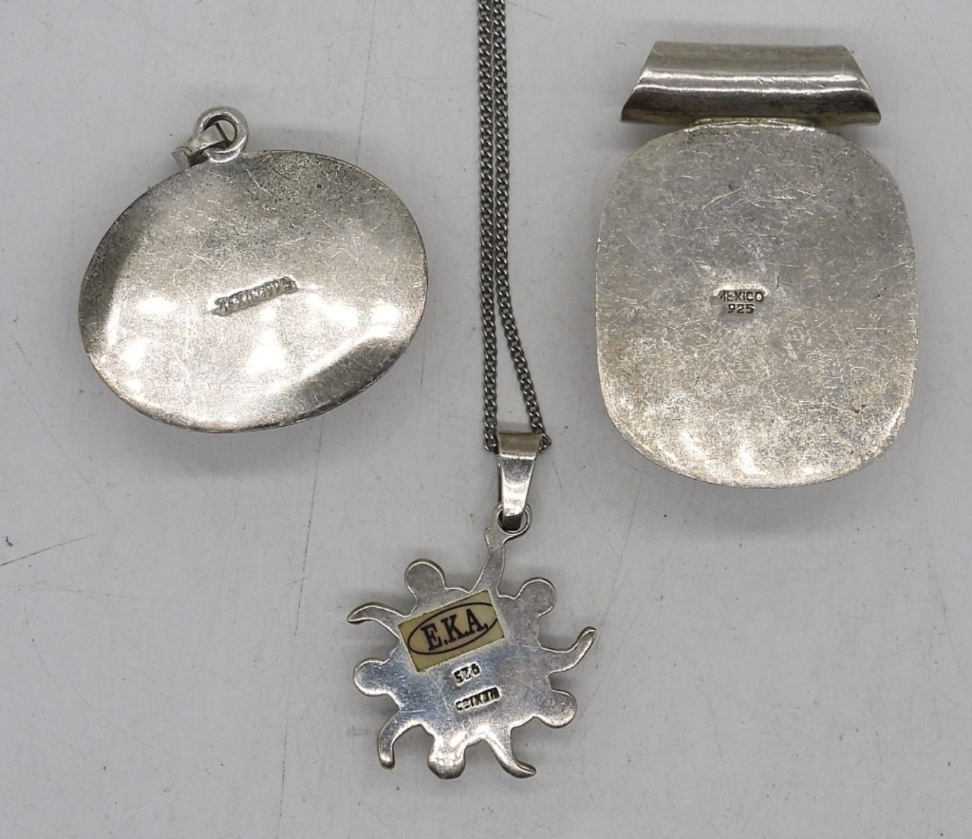 TWO LARGE VINTAGE GEMSTONE PENDANTS “MEXICO 925″, 1.5-2″ LONG. SMALL SUN PENDANT ON AN 18” STERLING CHAIN. 28 DWT