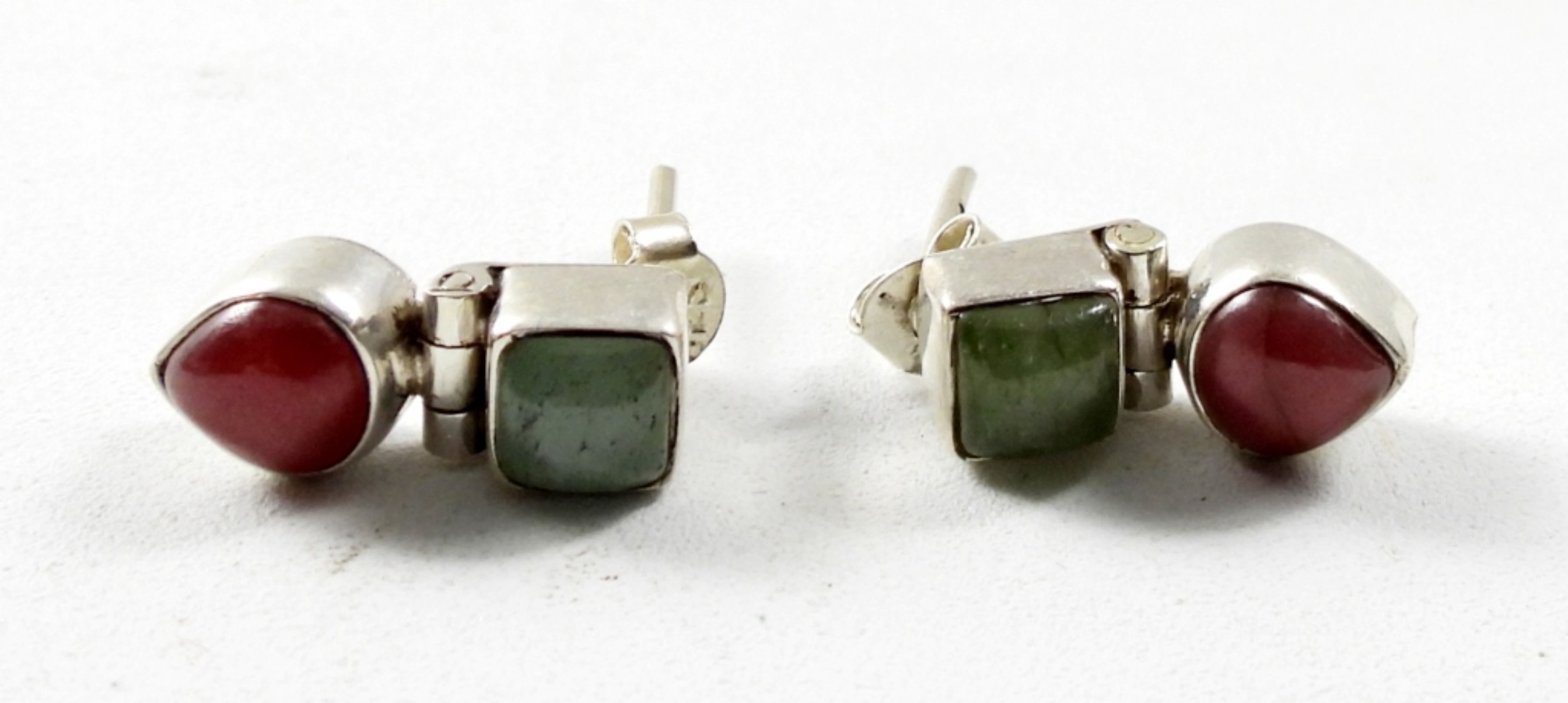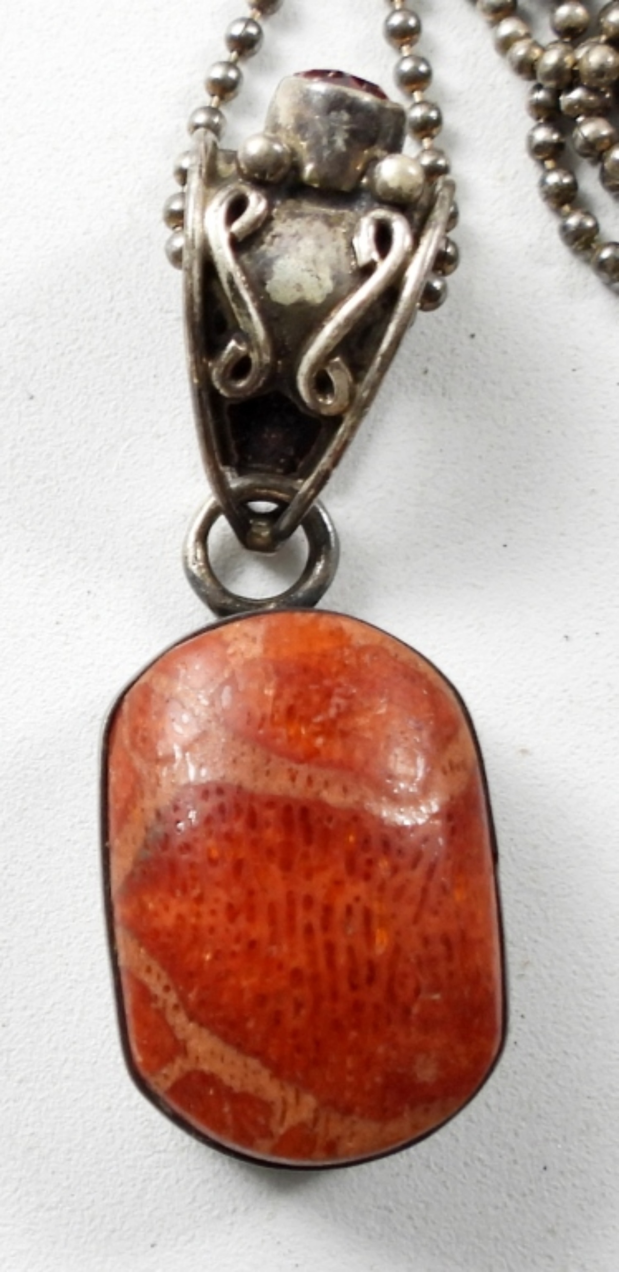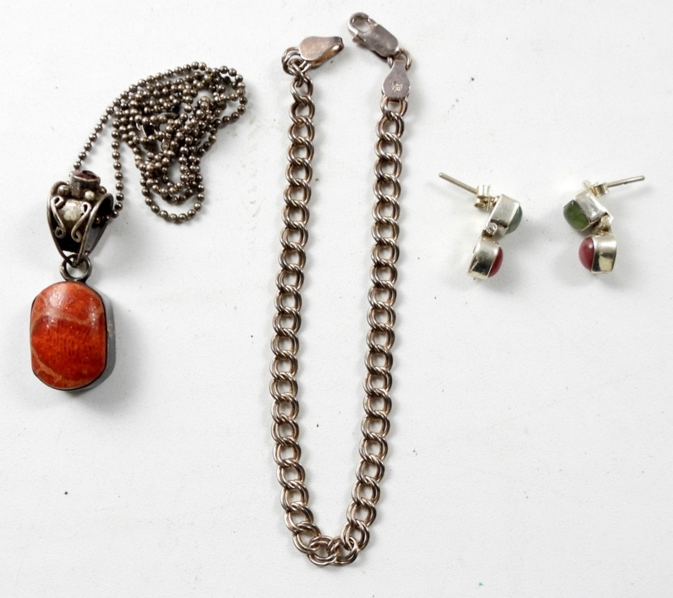 17″ NECKLACE WITH A RED GEM STONE,8″ BRACELET AND A PAIR OF PIERCED EARRINGS (11.9 DWT)