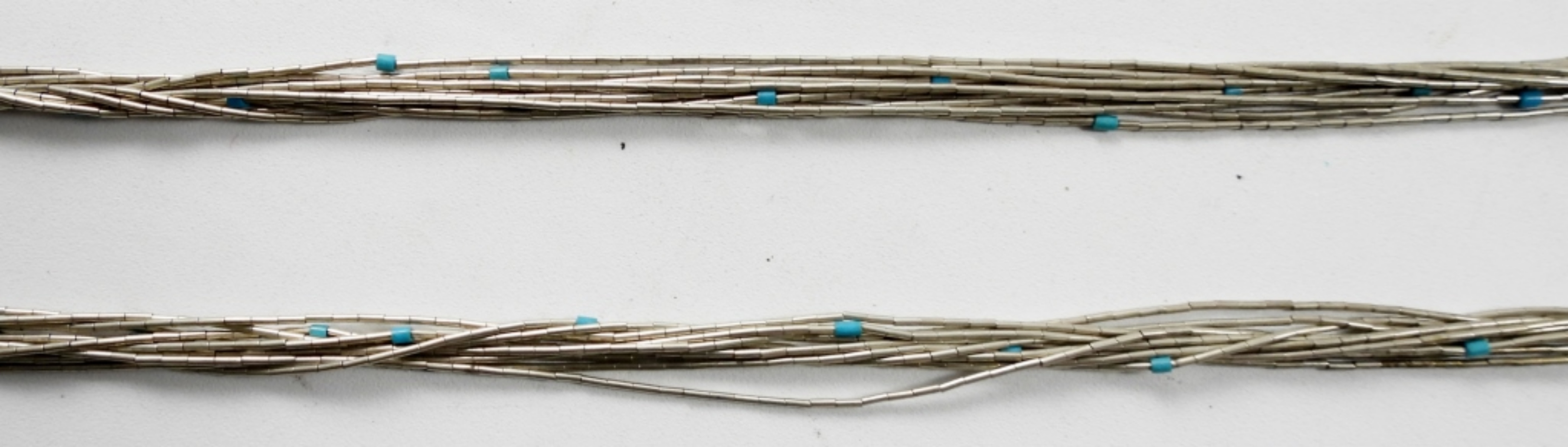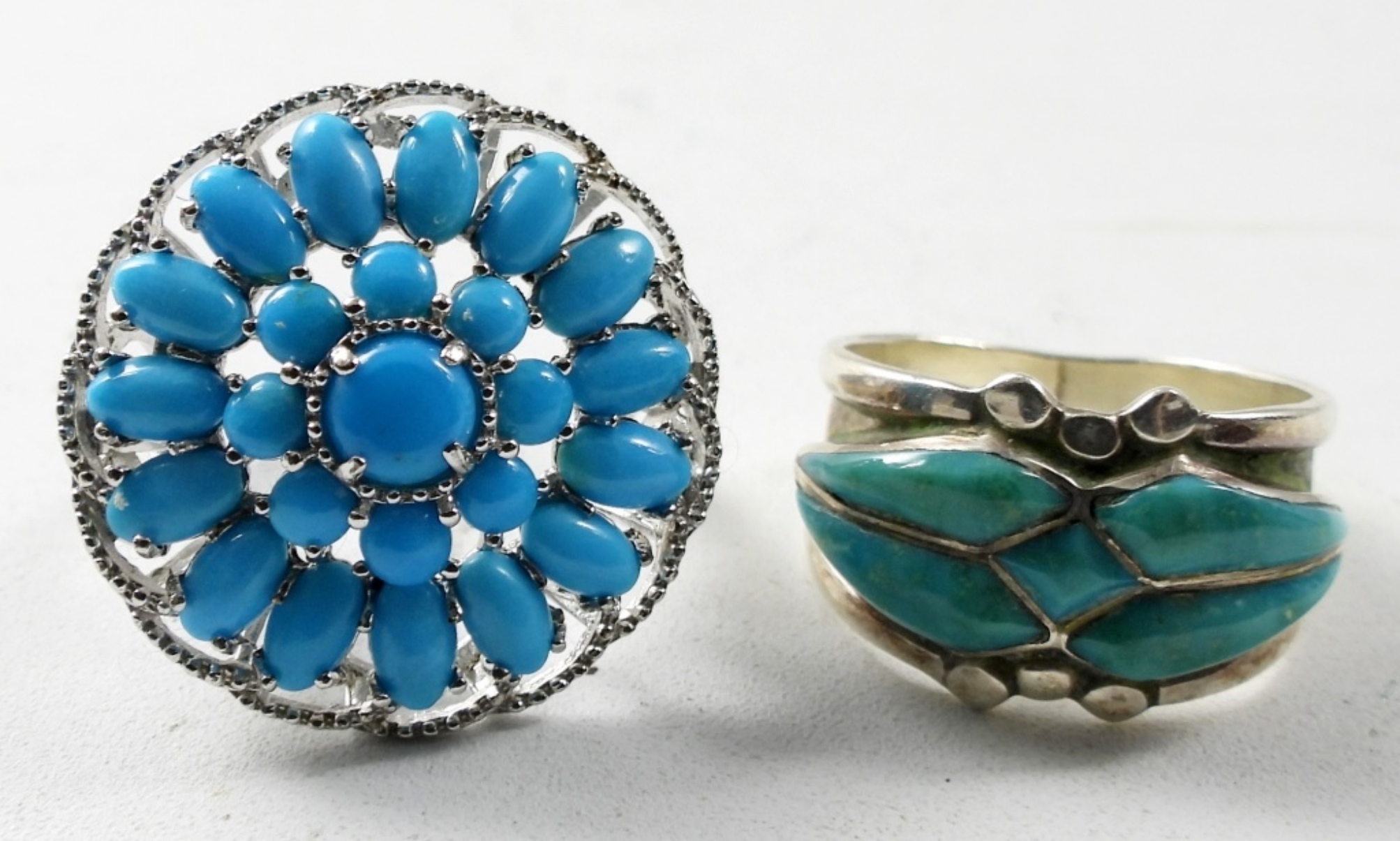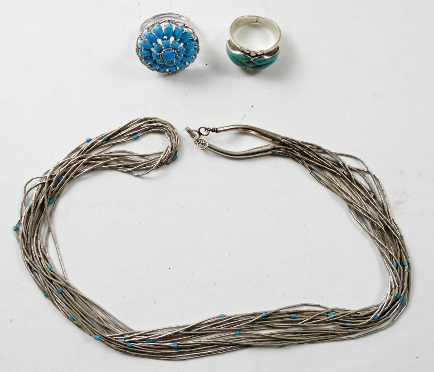 LADIES 26″ LIQUID STERLING NECKLACE AND 2 RINGS SIZE 7 BOTH WITH BLUE GEMSTONES (15.1 DWT)